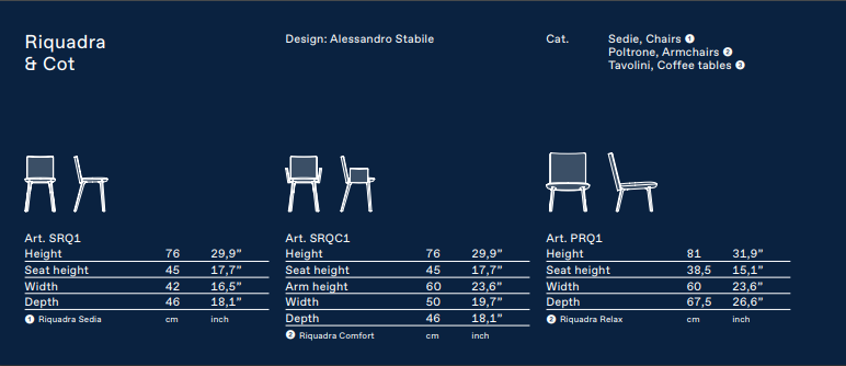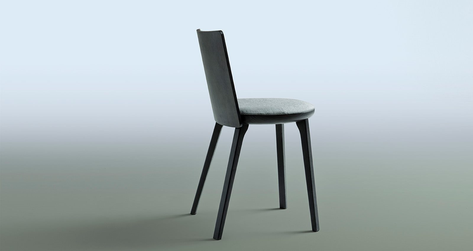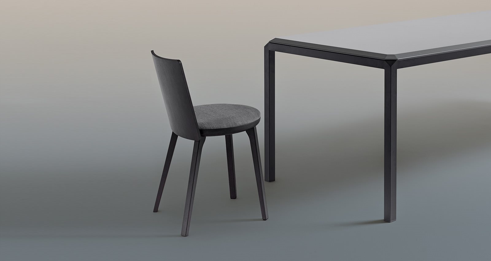 In versions with or without armrests, Riquadra explores new, original configurations through the montage of geometric forms. The circle for the seat and the square for the back have the same area, intersecting. The result is a juxtaposition of forms in which one geometric figure or the other stands out depending on the vantage point. The seat is padded and covered, while the circular frame in solid ash wood welcomes the legs – in the same material – permitting attachment of the back in curved wood.
