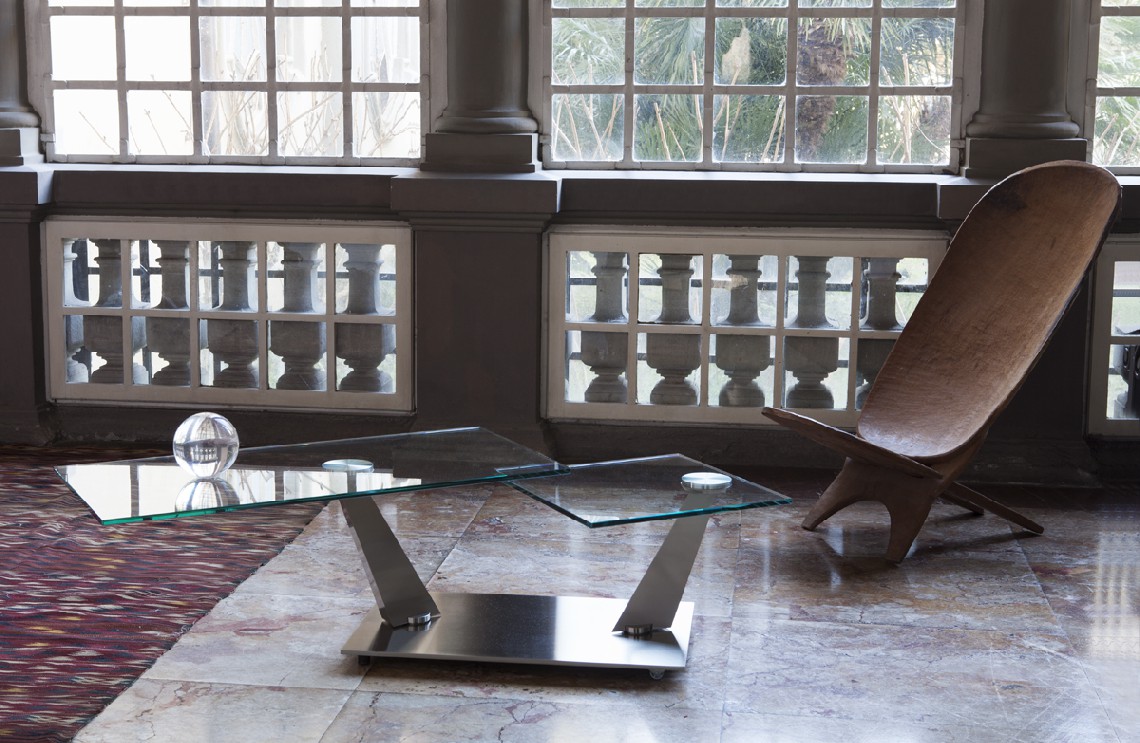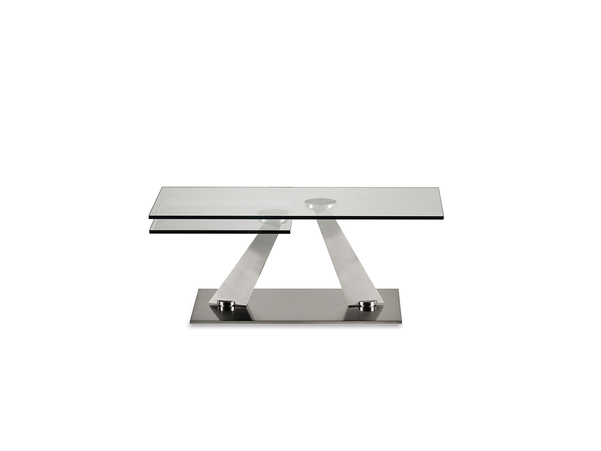 TAVOLINO ESTENSIBILE CON PIANI IN CRISTALLO GIREVOLI SINCRONIZZATI. BASE E SUPPORTI IN ACCIAIO VERNICIATO O GALVANIZZATO. DISPONIBILE ANCHE CON PIANI IN CERAMICA.