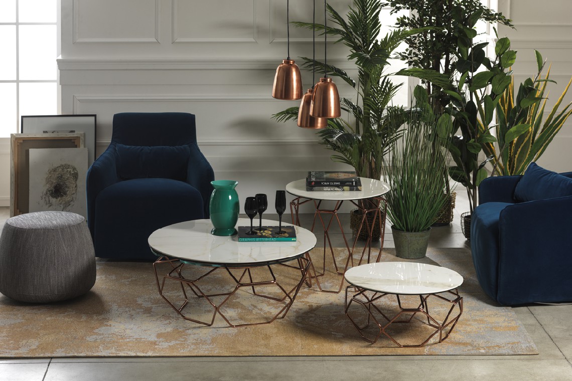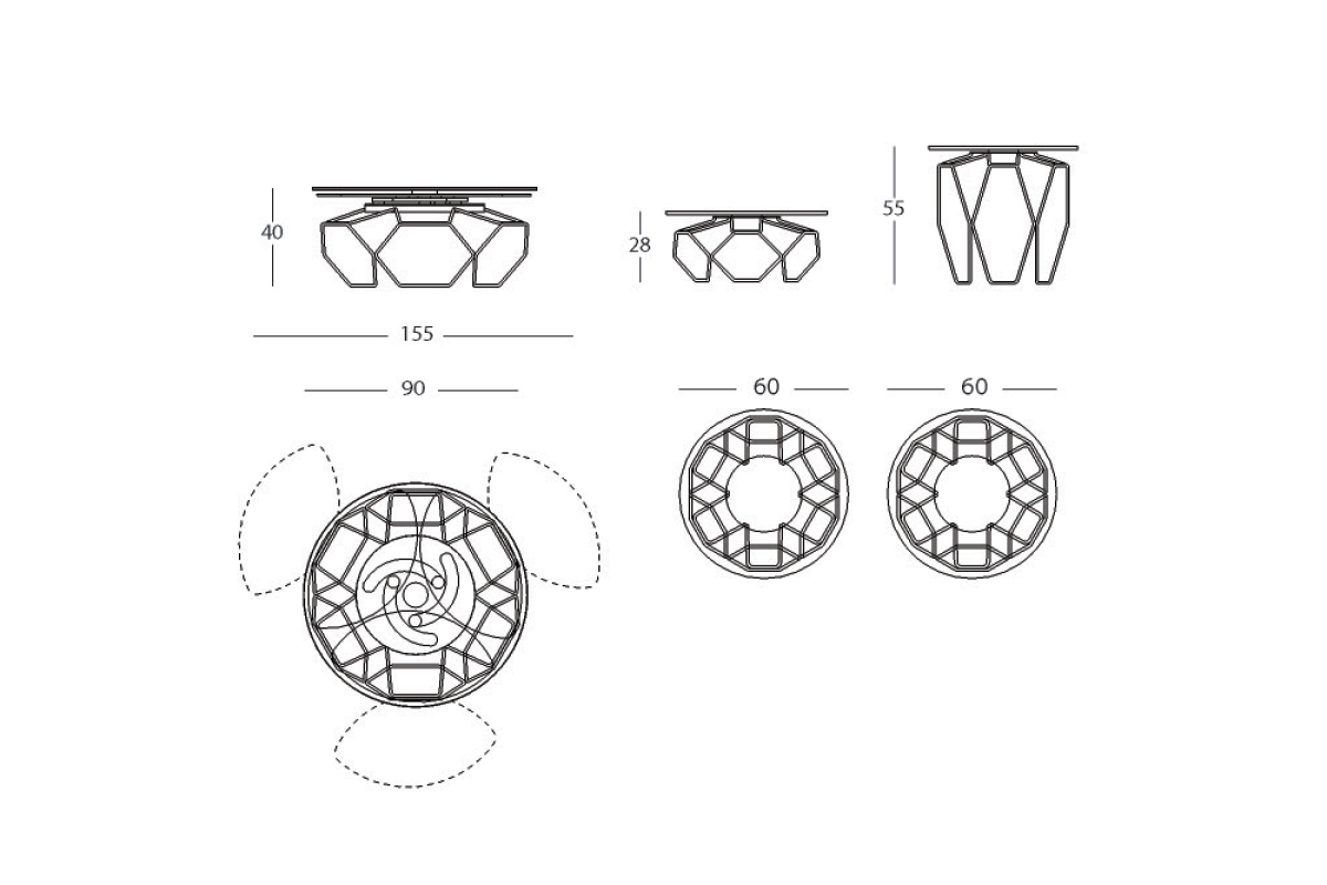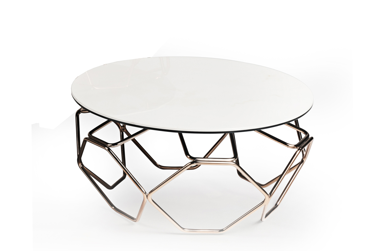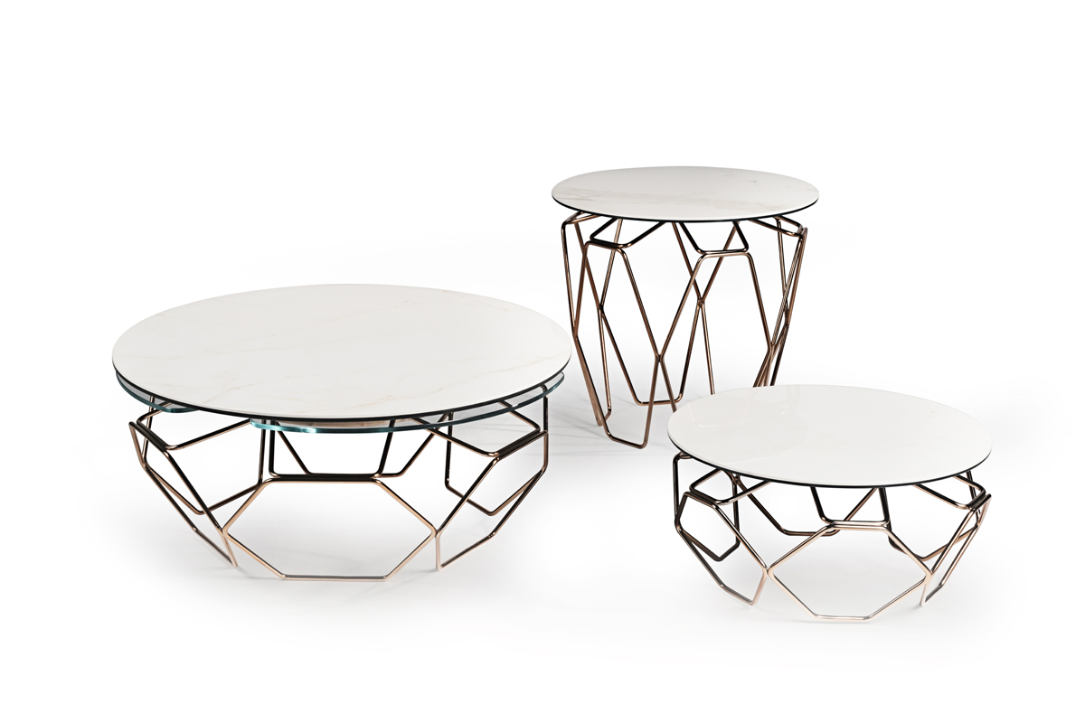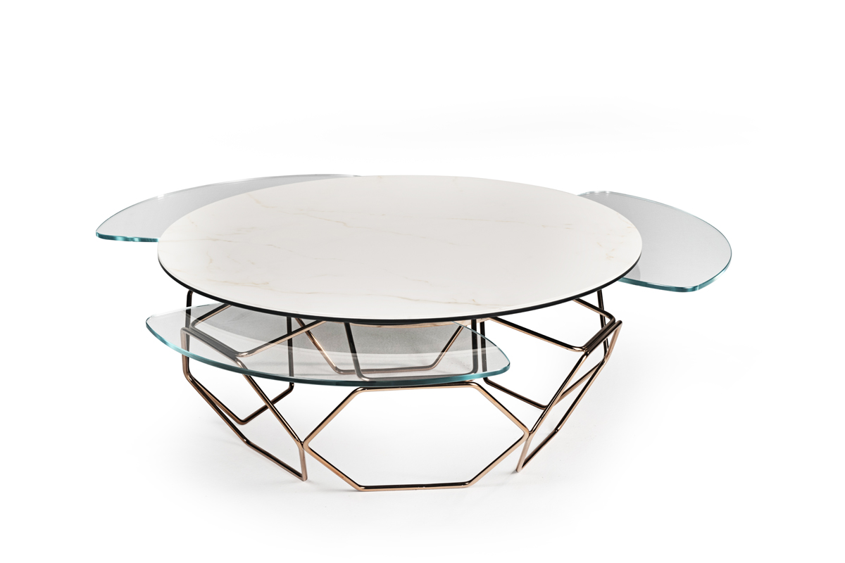 TAVOLINO ESTENSIBILE CON PIANI IN CERAMICA E CRISTALLO, BASE IN ACCIAIO VERNICIATO O GALVANIZZATO. DOTATO DI UN INNOVATIVO MECCANISMO CHE, ATTRAVERSO LA SOLA ROTAZIONE DEL PIANO SUPERIORE, PERMETTE AI TRE PIANETTI SOTTOSTANTI DI APRIRSI. DISPONIBILE ANCHE SENZA MECCANISMO.