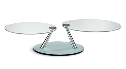 TAVOLINO ESTENSIBILE CON PIANI GIREVOLI SINCRONIZZATI IN CRISTALLO. SUPPORTI IN ACCIAIO VERNICIATO O GALVANIZZATO. LA BASE IN CRISTALLO STRATIFICATO E’ DOTATA DI UN MECCANISMO PER LA ROTAZIONE SINCRONIZZATA, CHE CONSENTE UN’AMPIA MODULAZIONE DELLA POSIZIONE DEI CRISTALLI.