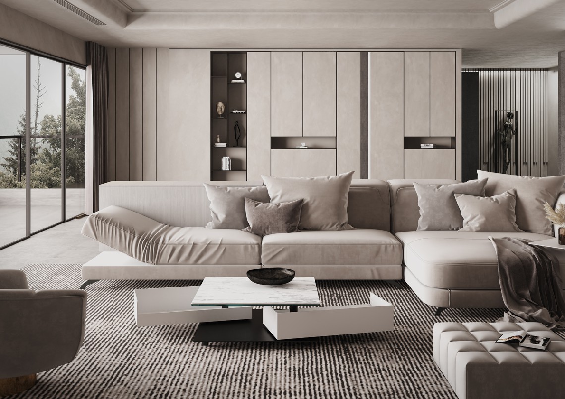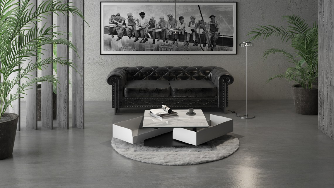 TAVOLINO QUADRATO APRIBILE CON PIANI IN CERAMICA O IN VETRO. BASE E CASSETTI DISPONIBILI NELLE FINITURE VERNICIATE. DOTATO DI MECCANISMO PER L'APERTURA SINCRONIZZATA DEI DUE CASSETTI.