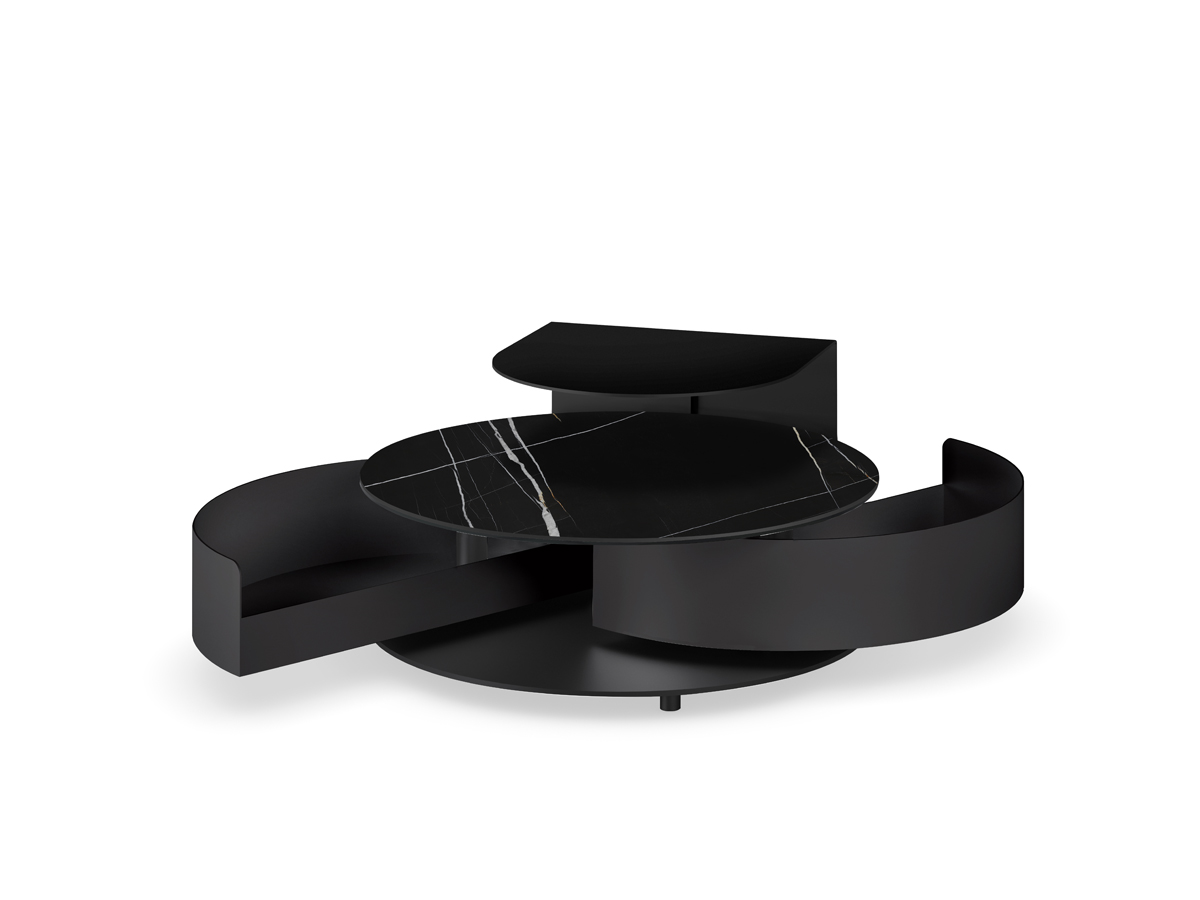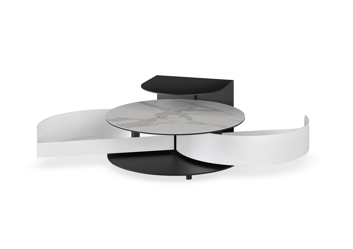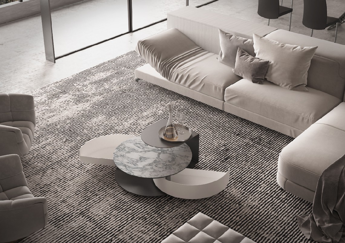 TAVOLINO ROTONDO APRIBILE CON PIANI IN CERAMICA O IN VETRO. BASE E CASSETTI DISPONIBILI NELLE FINITURE VERNICIATE.