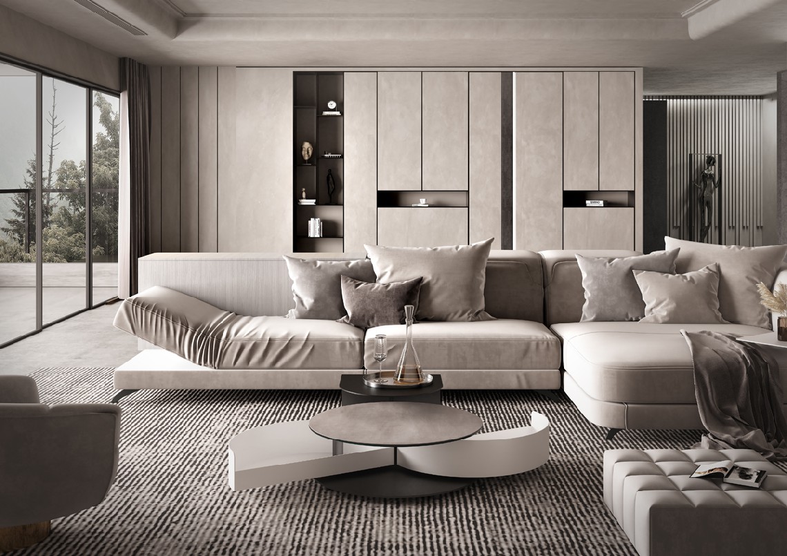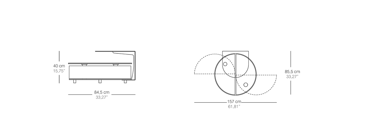 FORNITO DI RIPIANO LATERALE AGGIUNTIVO DISPONIBILE NELLE FINITURE VERNICIATE, IL TAVOLINO é DOTATO DI MECCANISMO PER L'APERTURA SINCRONIZZATA DEI DUE CASSETTI.