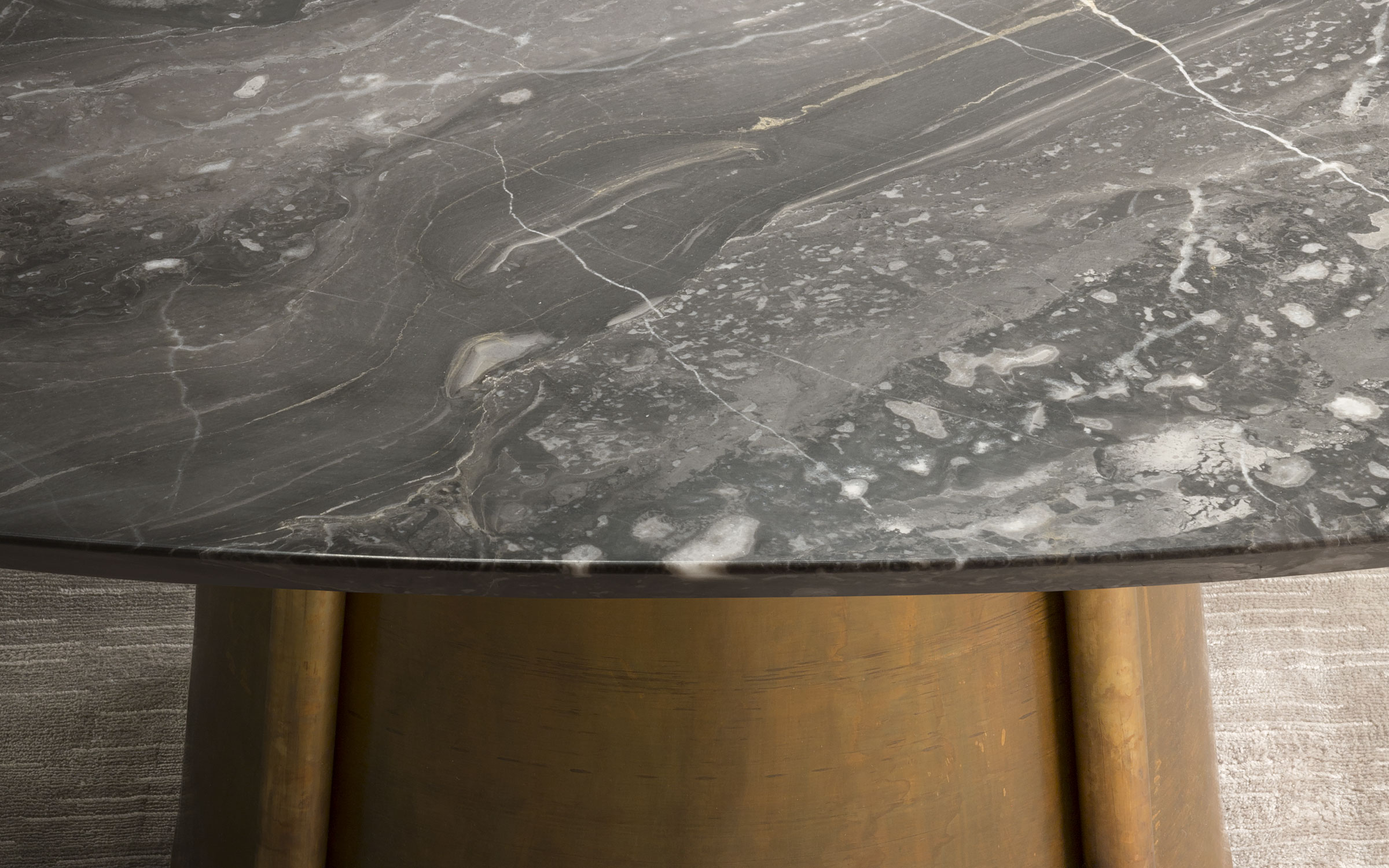 Inspired by a hot-air balloon, the table Balloon is characterised by its unique structure and the original base in anodic bronze. The round marble top is available in two measurements. The finish can be selected from the Flou marble collections.