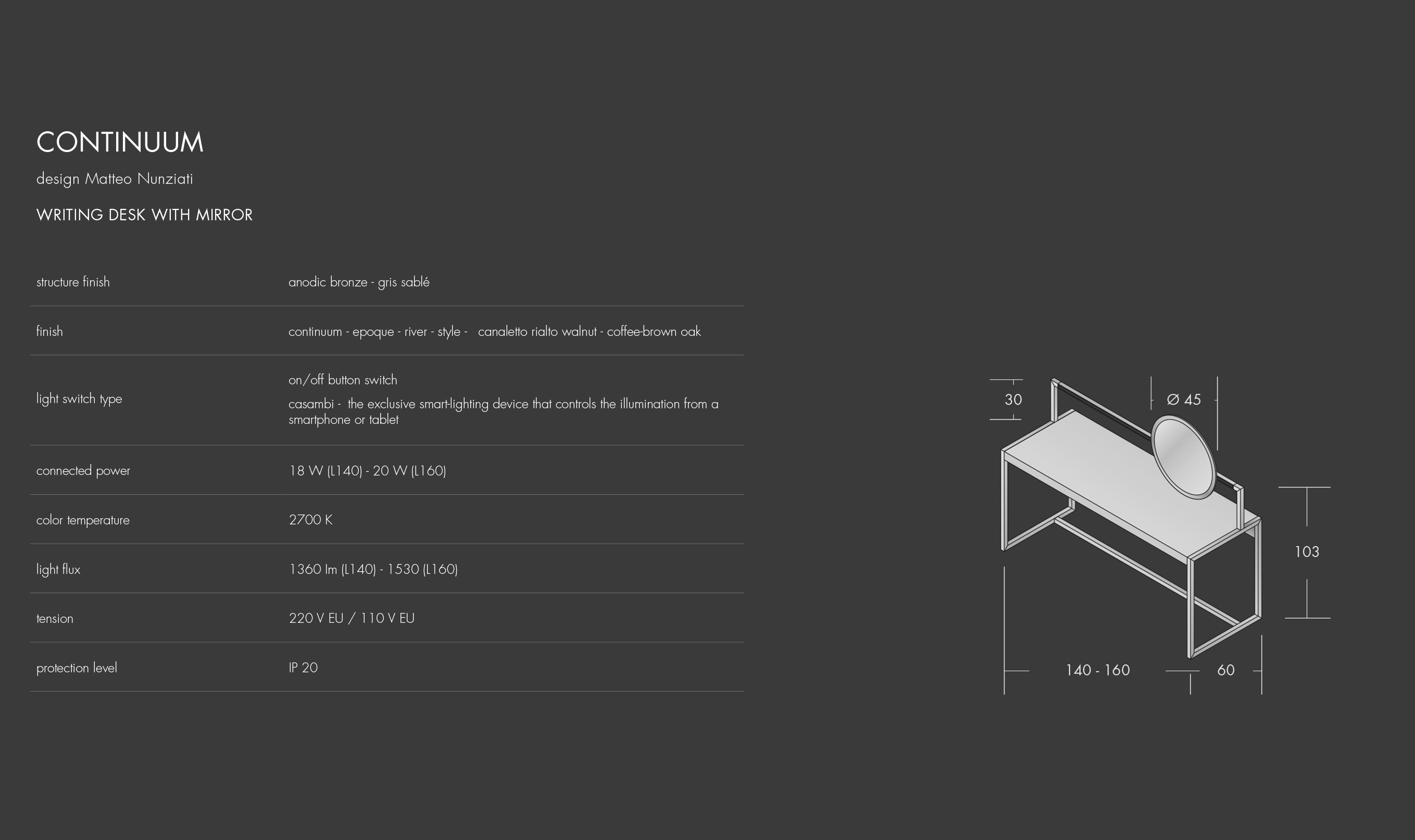 The structure has an anodic bronze or gris sablè finish. The top is available in two wood finishes (coffee-brown oak or Canaletto Rialto walnut), or a special scratch-resistant, heat-structured finish available in a range of colours.
