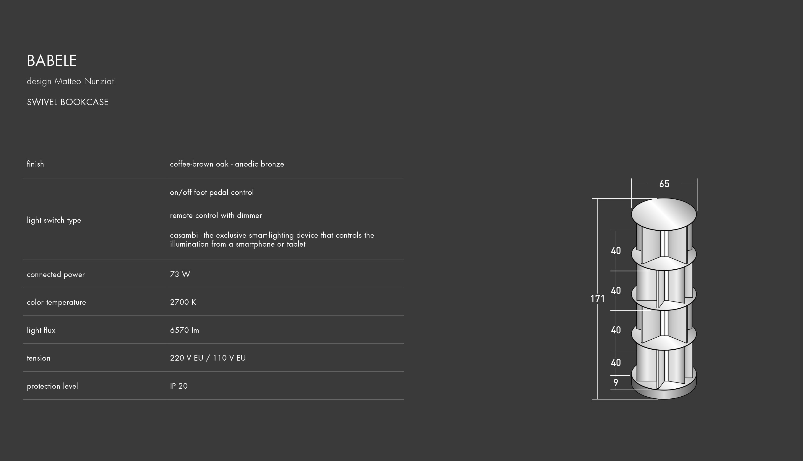 The swivel bookcase Babele has a delightfully rounded shape created by its structure in matt burnished metal and coffee-brown oakwood. This bookcase has been produced by applying avant-garde construction solutions. The shape was inspired by ancient Yemenite architecture and the result is an original and highly sophisticated article.