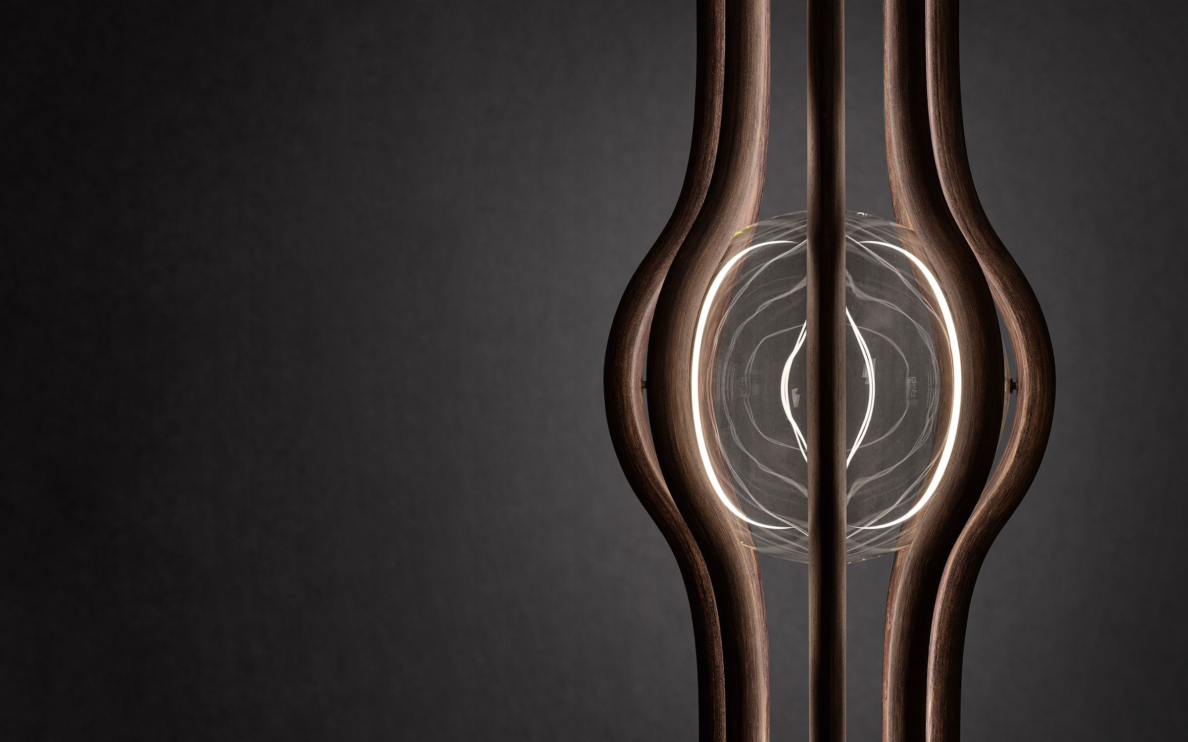 Eight slim curved slats, with a coffee-brown oak finish, engulf and support a blown glass ball (available in three versions: transparent, smoked and bronze); they can be positioned as desired in the top or bottom half of the lamp.