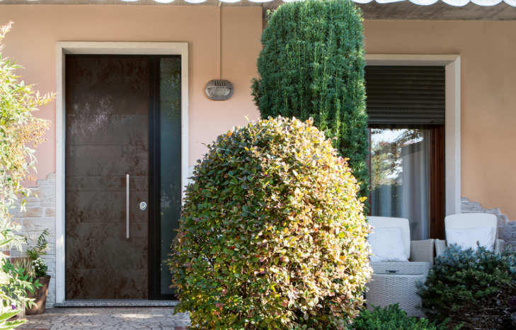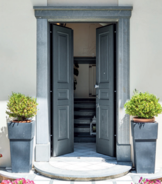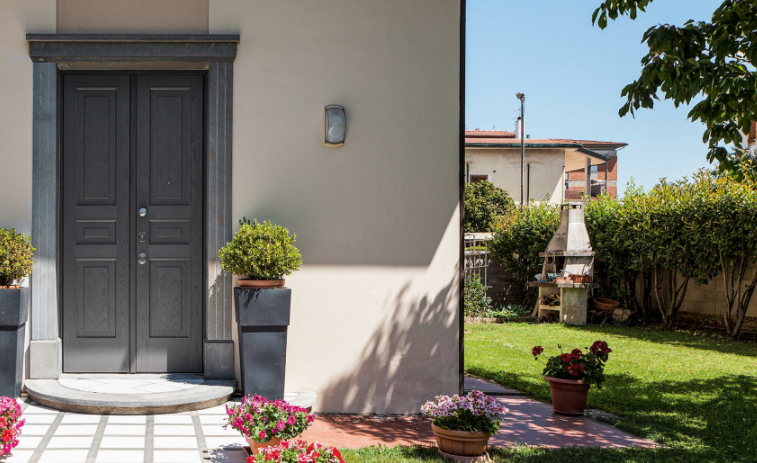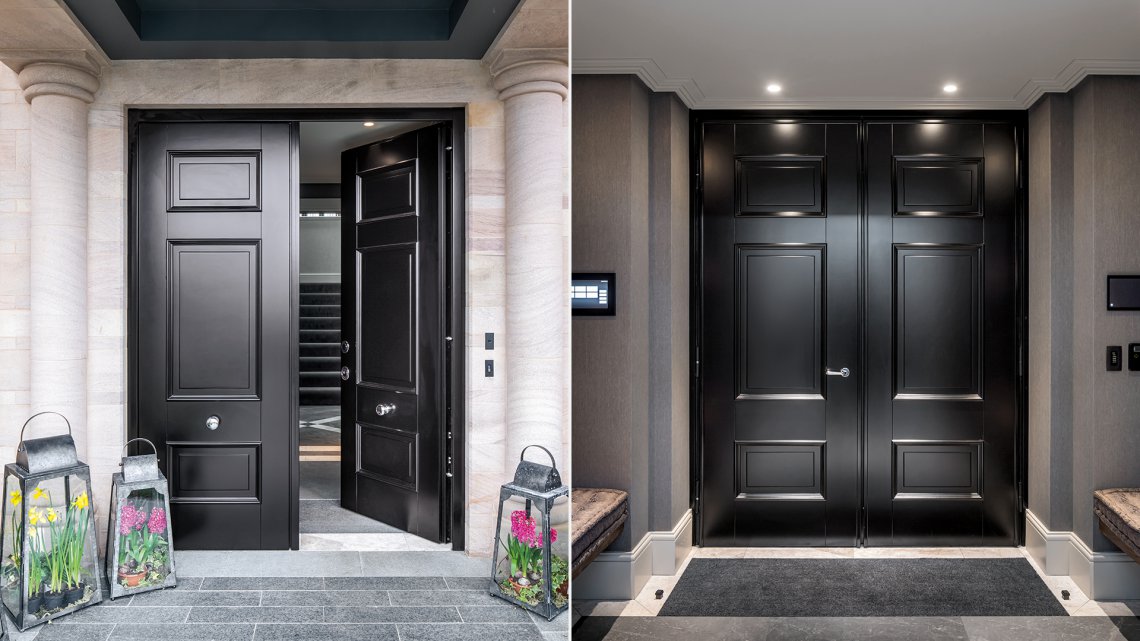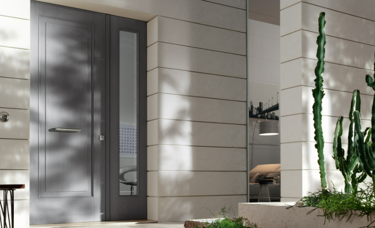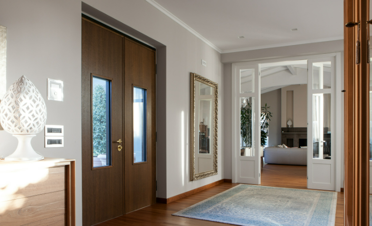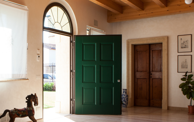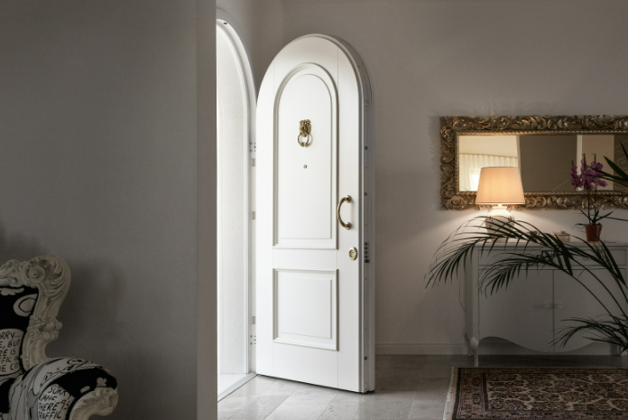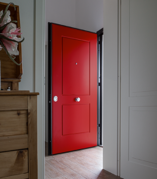Porta blindata con cerniere a vista che soddisfa ogni richiesta di personalizzazione.L'estetica classica interpretata con il legno, i colori e le lavorazioni ricercate per valorizzare la porta blindata in una vasta gamma di forme e dimensioni. Può essere realizzata a disegno, con inserimento del vetro blindato, multianta, accompagnata da un fianco luce o sopraluce. Sono sempre garantite le massime prestazioni in termini di sicurezza, isolamento termico, isolamento acustico, resistenza aria/acqua/vento.