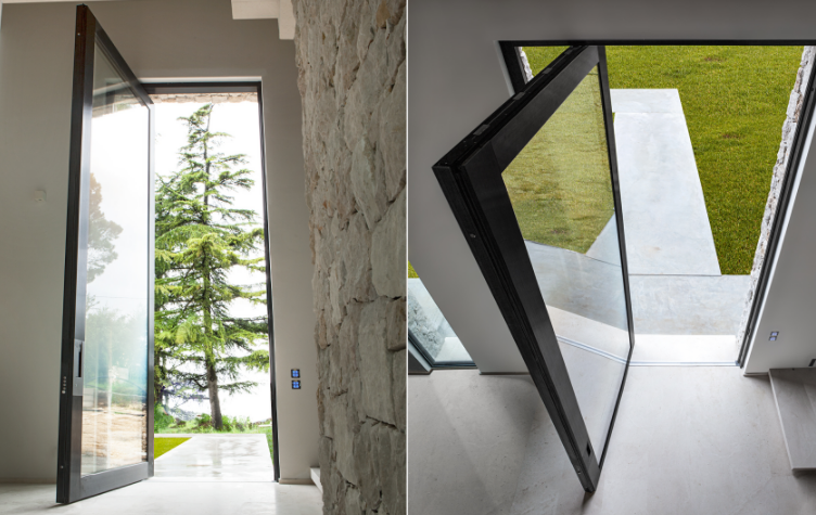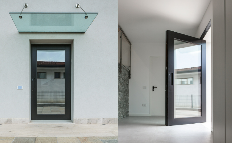 Porta blindata a bilico vetrata che permette di creare ingressi di qualsiasi dimensione.Nova è la porta a bilico vetrata che consente nuove possibilità progettuali nello spazio dell’ingresso: il dialogo serrato tra interno ed esterno continua, rivolgendo lo sguardo oltre la soglia e portandoci il paesaggio dentro.