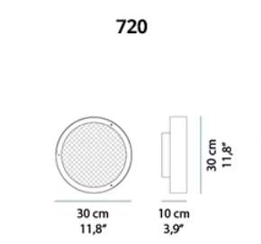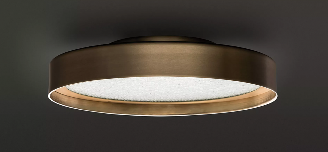 Available in the ?40 and ?50 ceiling versions or the ?30 version for use either as a ceiling light or wall light, Berlin takes the form of a thick metal ring with a slender profile enclosing a disc of wire mesh glass inside it. The anodized brass finish recalls echoes of Art Deco, given a contemporary update in the shapes, and in the use of LED as the light source.