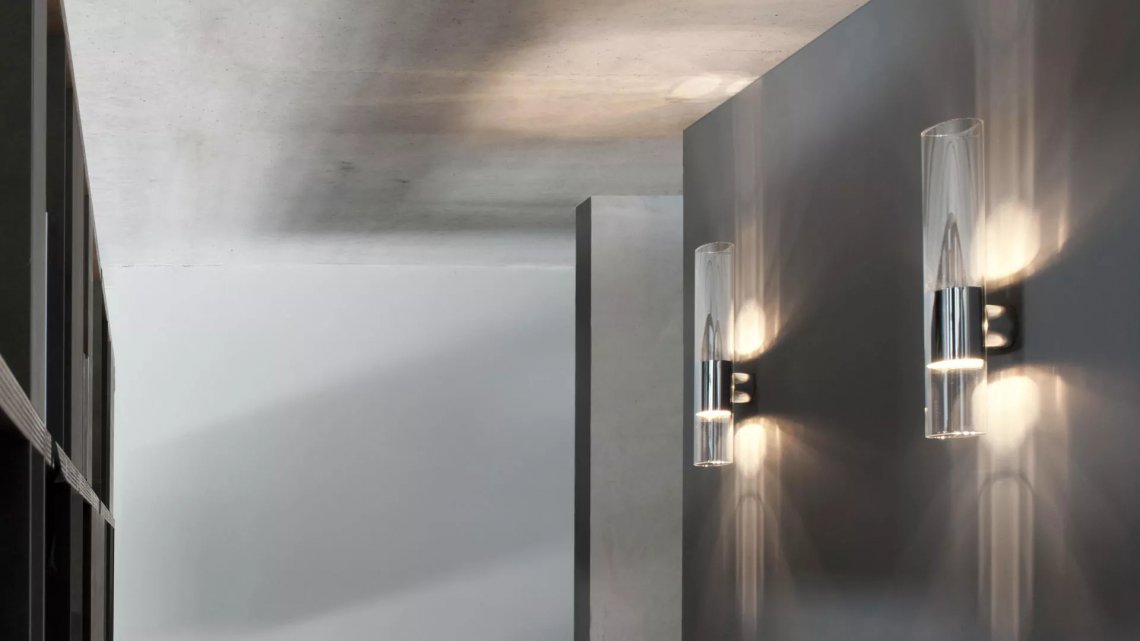The Line wall lamp uses the special oval Pyrex glass to portray an essential, minimal image, yet at the same time which is strongly characterised. The generous size, the importance of the material, the partial polished aluminium coating, the existence of two light sources that diffuse the light both upwards and downwards, make Line a versatile product.