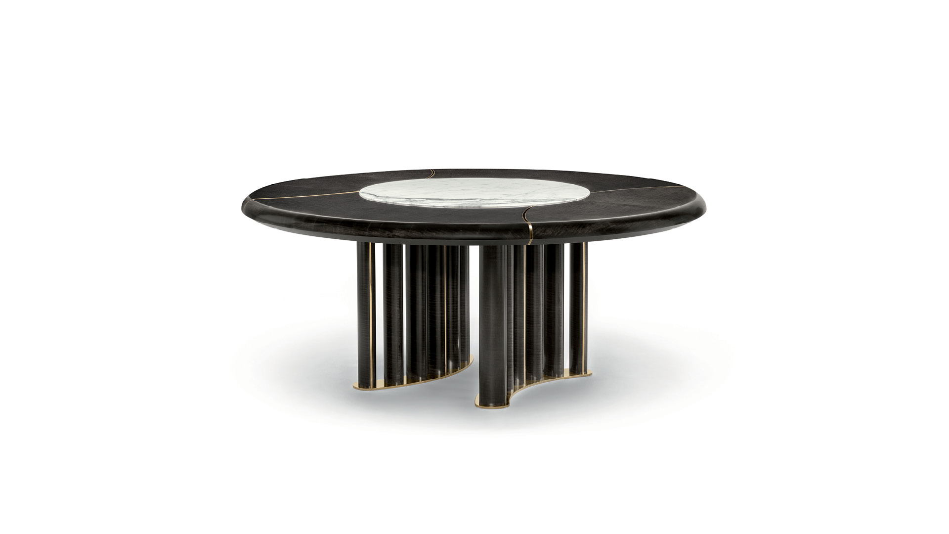 Il tavolo rotondo con inserti in metallo Oliver è realizzato in materiali pregiati ed è ricco di dettagli. Nel piano in legno di acero frisé è inseritala lazy susan che interrompe il metallo curvo in finitura dorata che richiama la stessa lavorazione dei pilastrini delle basi.
