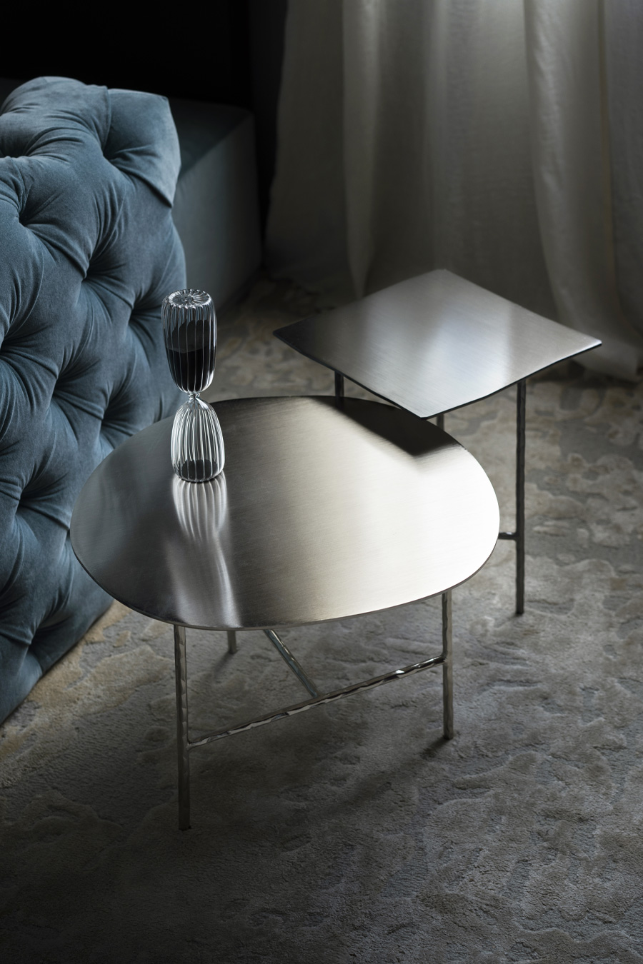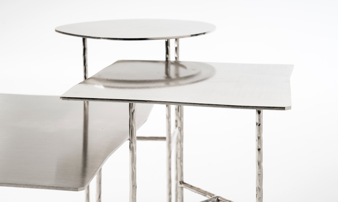 Ciò che salta subito all’occhio nella serie di tavolini da caffè XXX disegnata da Lapo Ciatti è il contrasto tra le finiture preziose e le forme volutamente irregolari, non finite.