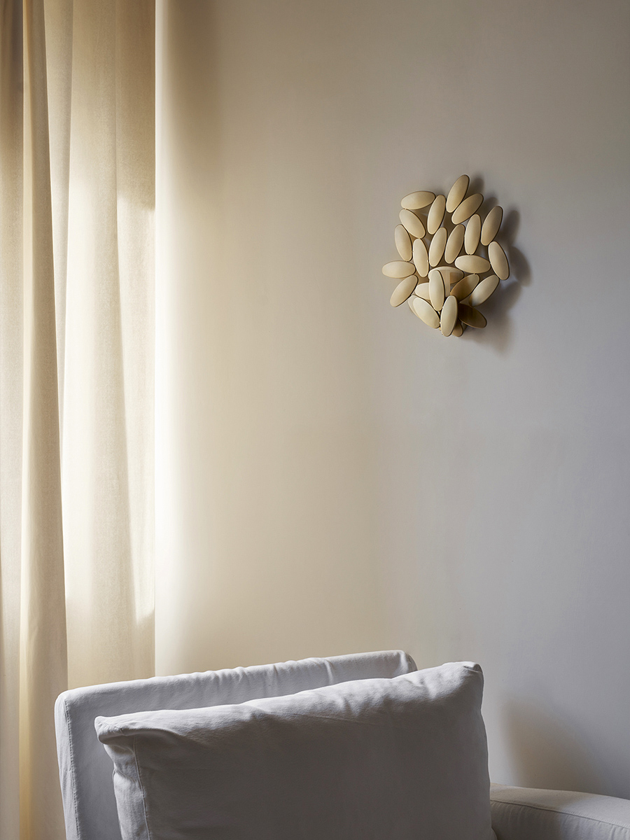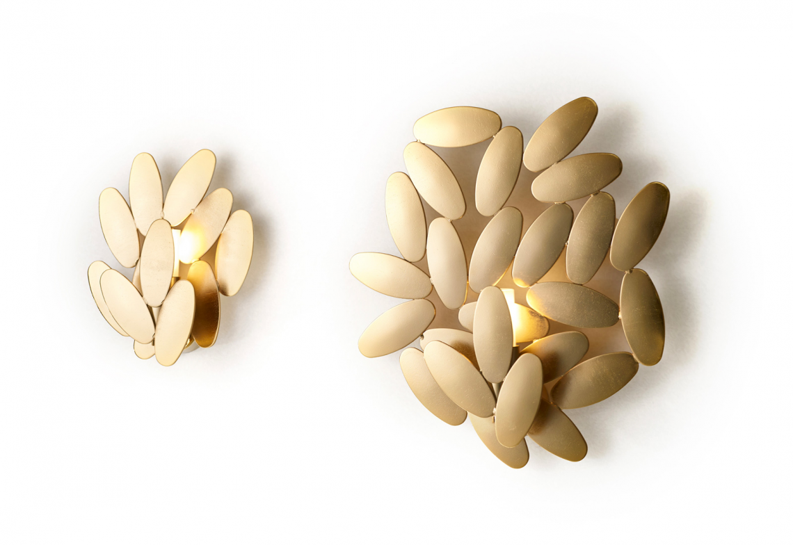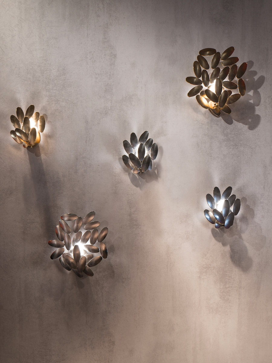 Tante foglie in acciaio saldate l’una con l'altra a formare una scenografica lampada da muro, esattamente come tante foglie in un albero formano la sua folta chioma. Si ispira all’universo vegetale la Foliae collection disegnata da Roberto Mora, all’innata capacità che hanno le foglie di unirsi, di fare gruppo e creare volumi.