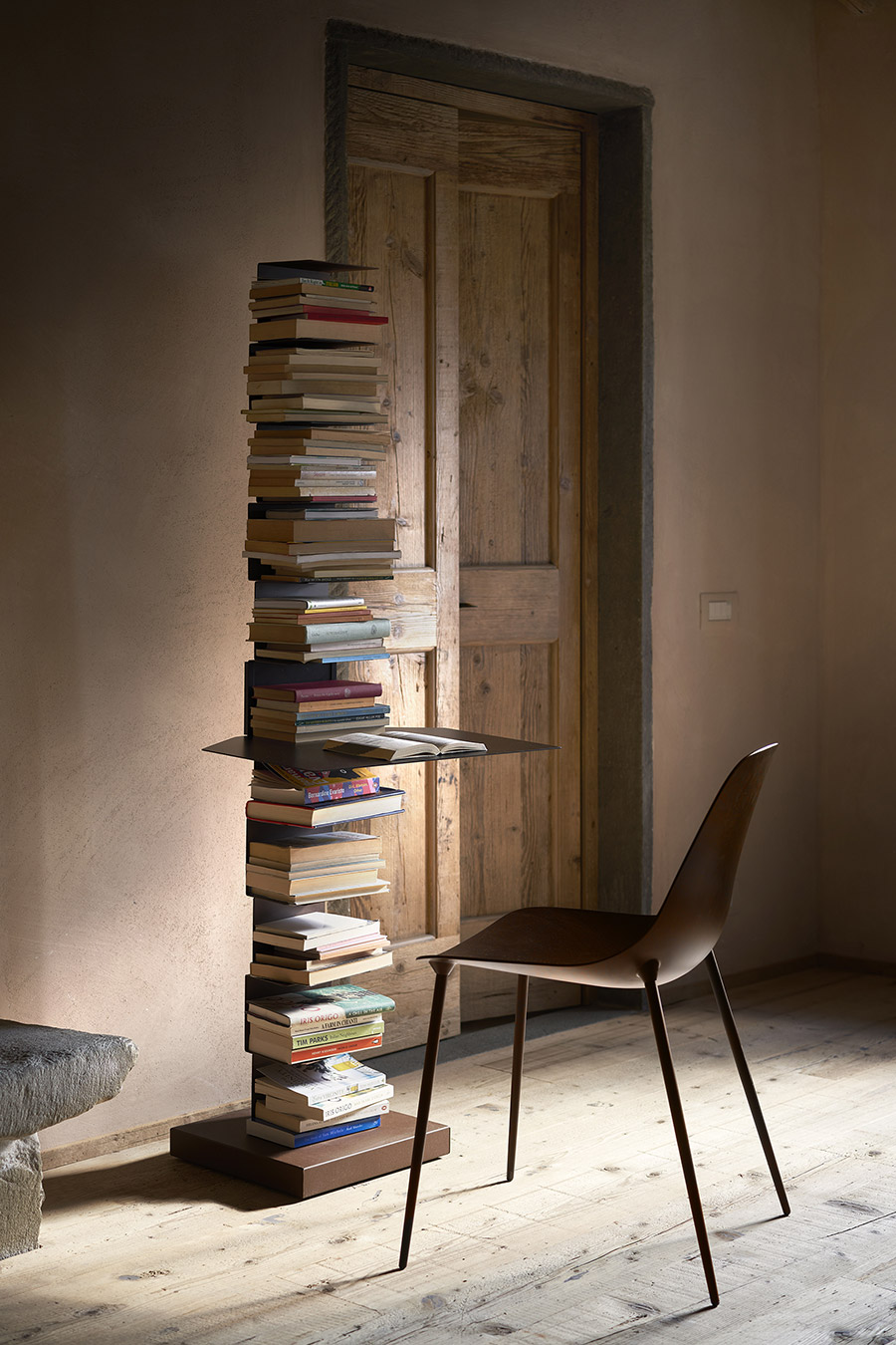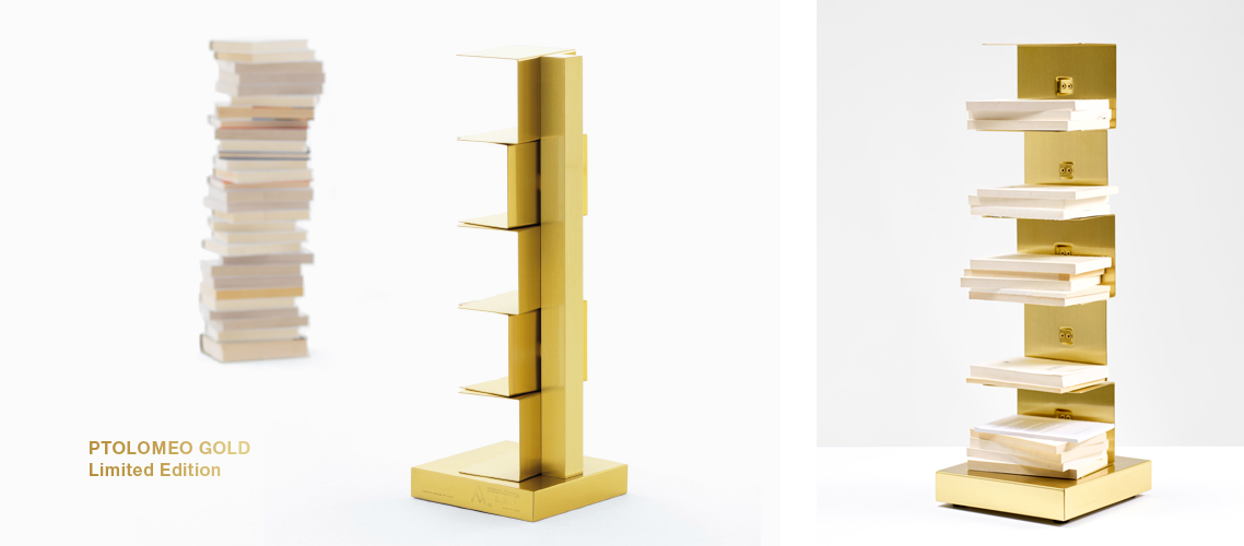 Original Ptolomeo è un contenitore che nasconde la sua forma per privilegiare il proprio contenuto, elimina il “superfluo” per mettere in evidenza il necessario, ovvero i libri. La libreria si presenta come una colonna in acciaio a cui sono unite delle sottili mensole anch’esse in acciaio. Mensole che scompaiono mano a mano che la colonna si riempie di libri, quando è colma Original Ptolomeo diviene del tutto impercettibile e sembra quasi che i libri posizionati su di essa si sorreggano da soli.