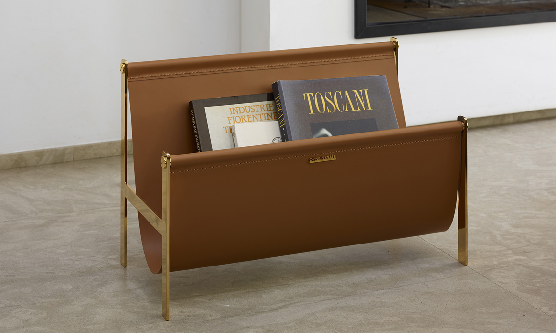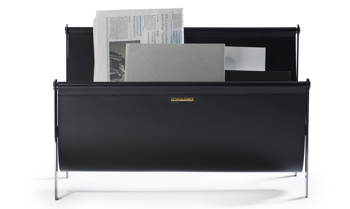 Portariviste, un oggetto così identitario da non aver bisogno di un nome diverso per definirlo. Portariviste tanto simile nel concetto quanto distante nella sostanza, dalla linea degli essenziali di Lapo Ciatti. Arredi - ILtavolo, LAlampada, ILletto, LApanca – e accessori Fermaporte e Portariviste appunto, tutti ugualmente caratterizzati dall’estrema riconoscibilità delle forme e dalla funzionalità pura, per i quali le presentazioni, se non inutili, appaiono quantomeno superflue. Portariviste è un oggetto dalla grande personalità, realizzato in cuoio, rigenerato nero o naturale, e struttura in acciaio lucido – nichel nero o oro 24 k – è perfetto in ogni stanza dove ci sia la necessità di mettere ordine con grinta e carattere. A casa, in un ufficio, nella lounge di un prestigioso albergo o nell’angolo lettura di un sofisticato bar.
