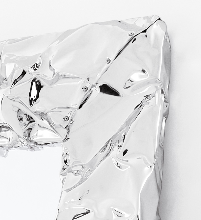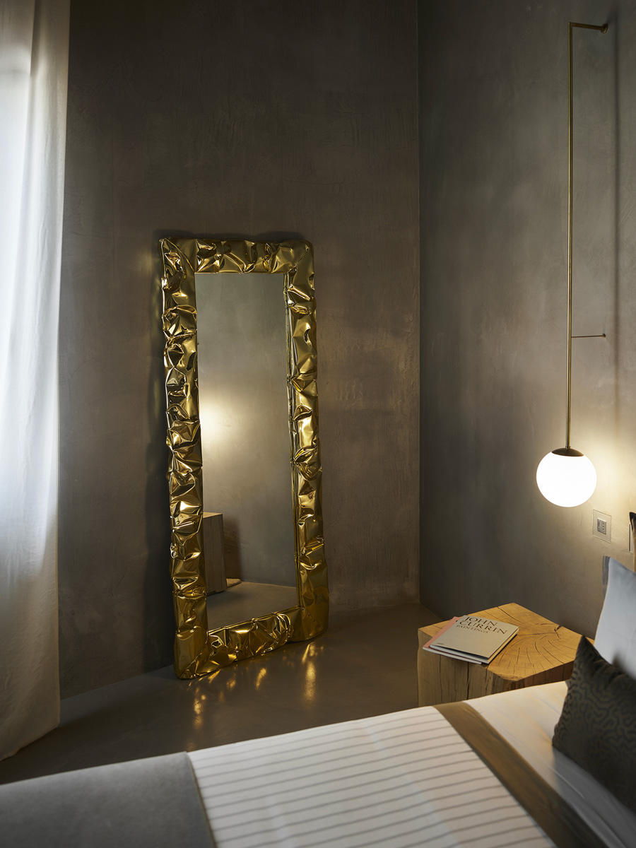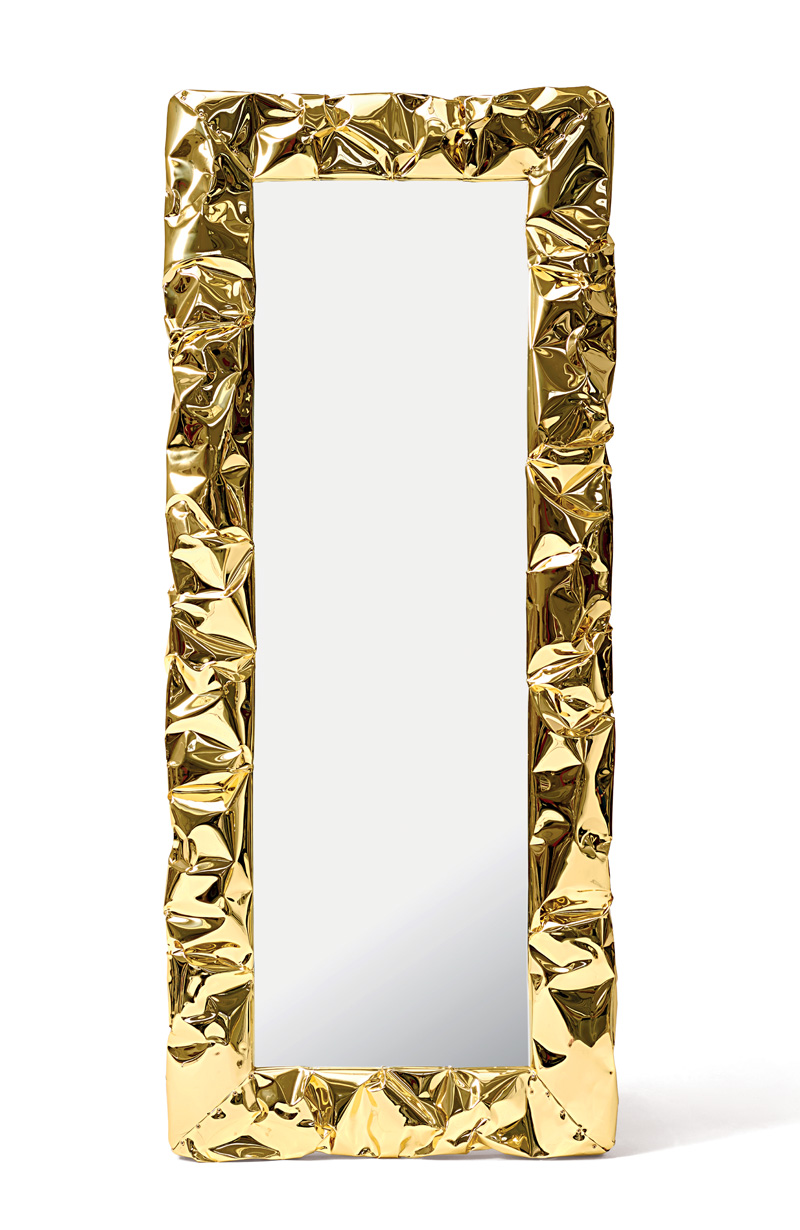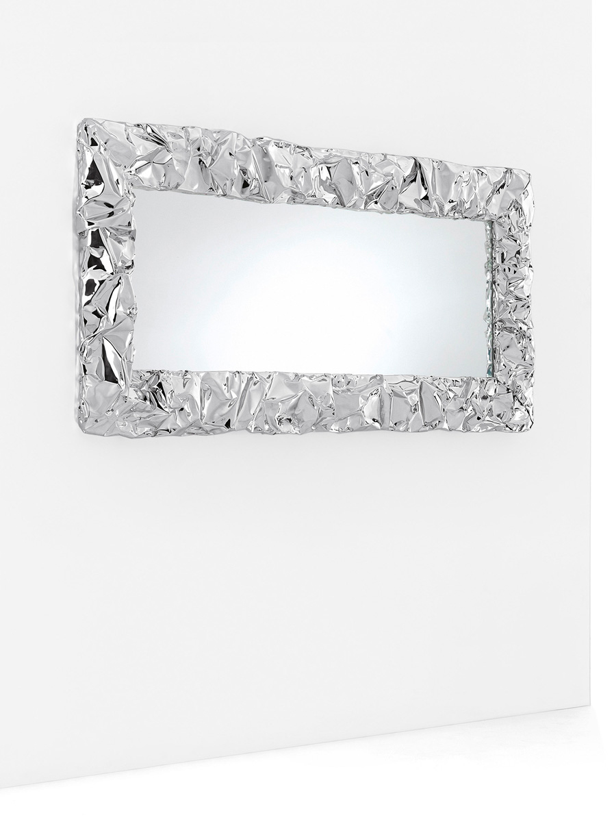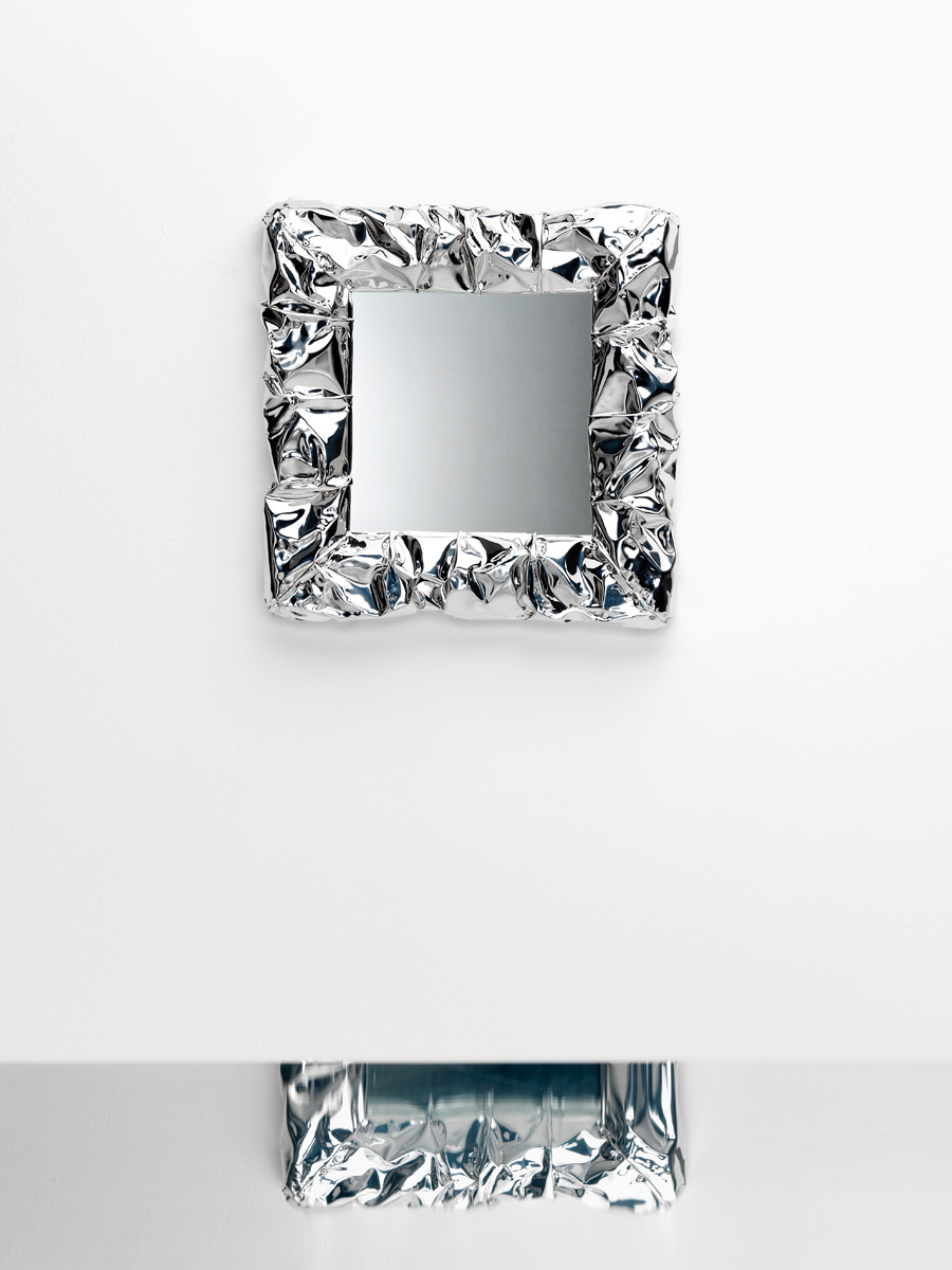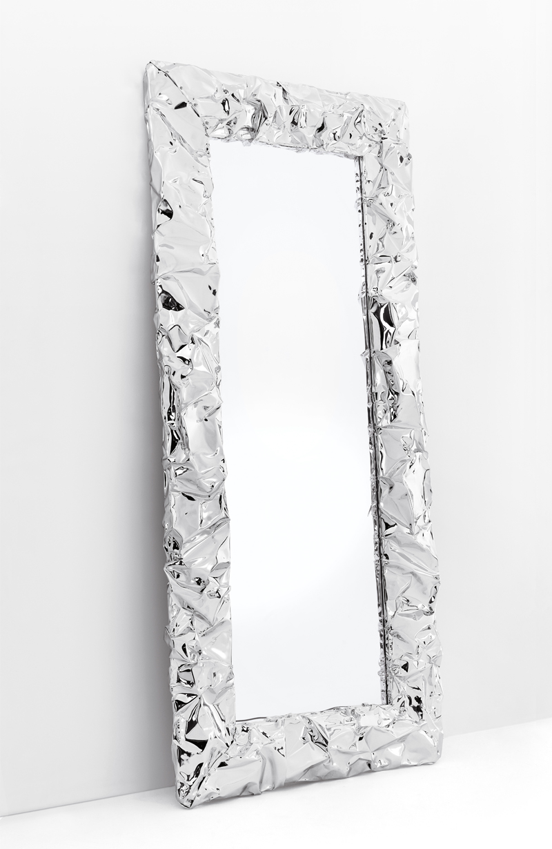 Viene voglia di toccarlo questo specchio, con la sua cornice spessa che ricorda l’effetto della carta stropicciata o dei fogli di alluminio. Una superficie cangiante quella dei Tab.u Mirror così “mossa” da sembrare morbida ed estremamente malleabile e che invece, al tatto, si rivela per quello che è una rigida cornice realizzata in resistente alluminio sapientemente modellato a mano