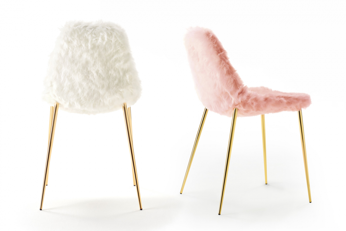 La scocca inpressofusione di alluminio è infatti rivestita da una morbida eco pelliccia che trasmette immediatamente una sensazione di accogliente comodità senza rinunciare a quel tocco glamour, che è tratto distintivo delle sedie Mammamia.