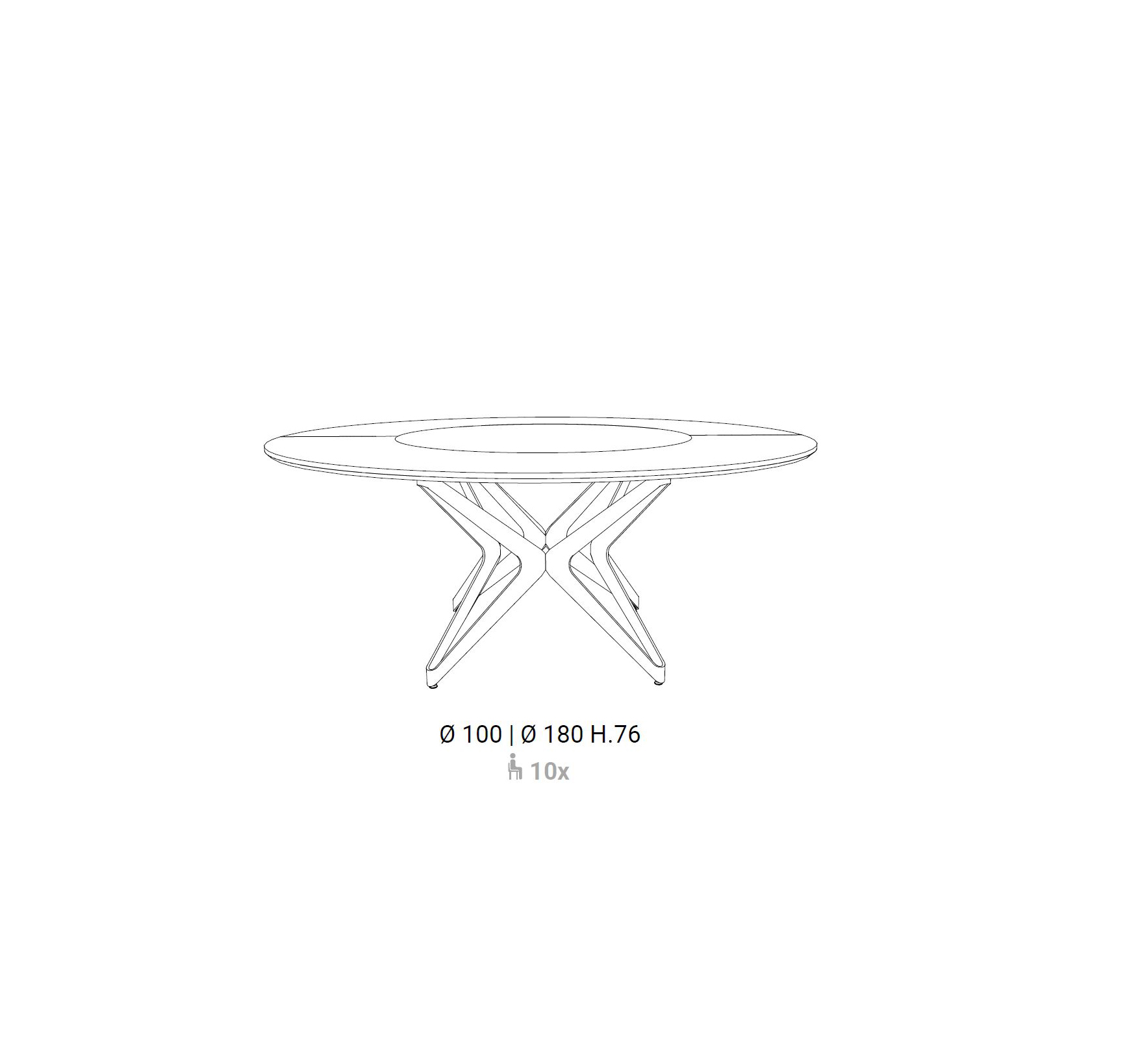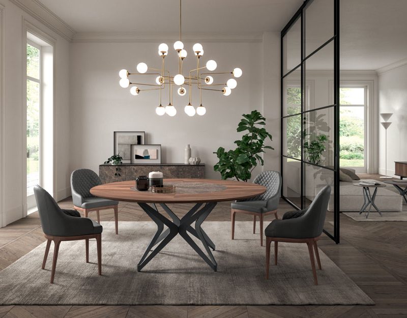 Tavolo con vassoio centrale girevole incassato nel piano da 26mm. La rotazione è di 360° su asse verticale. Basamento in metallo e piedini regolabili in altezza.