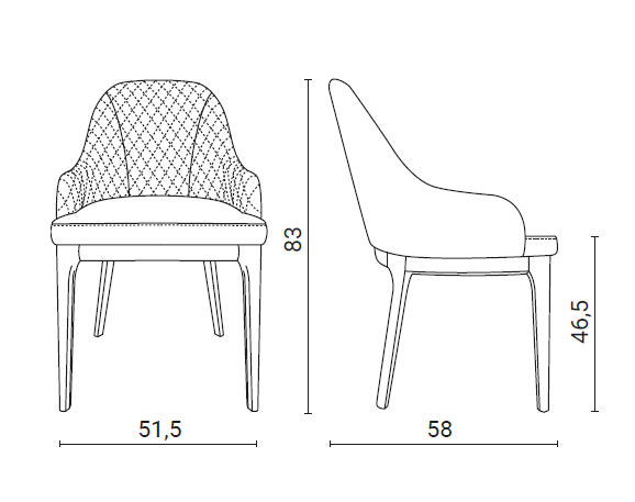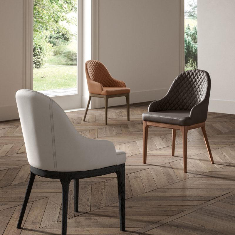 Poltroncina con seduta rivestita in pelle, eco pelle nabuk o velvet con interno trapuntato. Base in massello di frassino spazzolato.