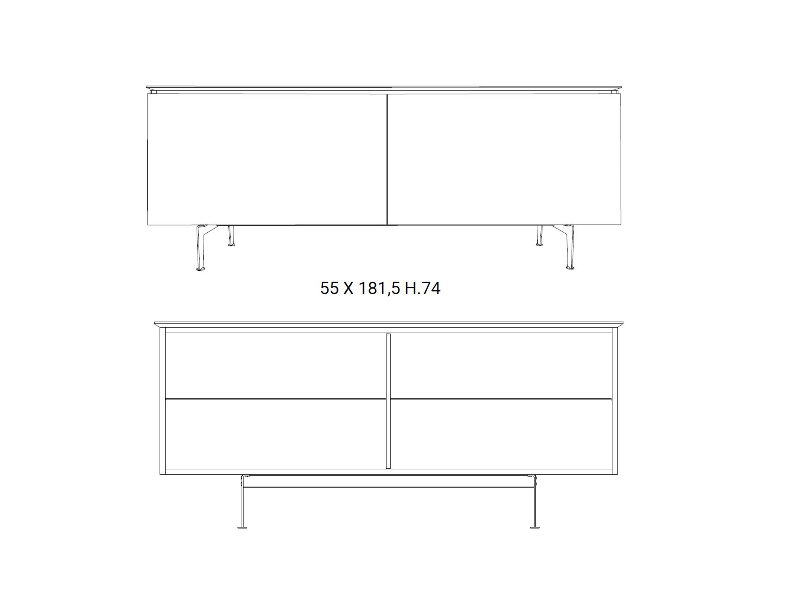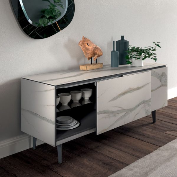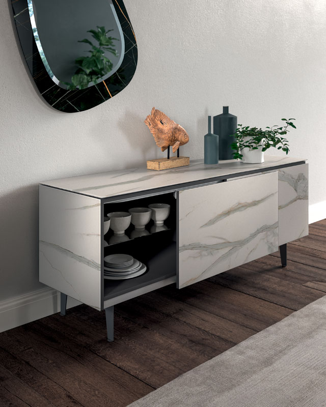 Madia a 2 vani, fianchi, top e ante in marble glass. Ripiani interni in cristallo e piedini in metallo verniciato.