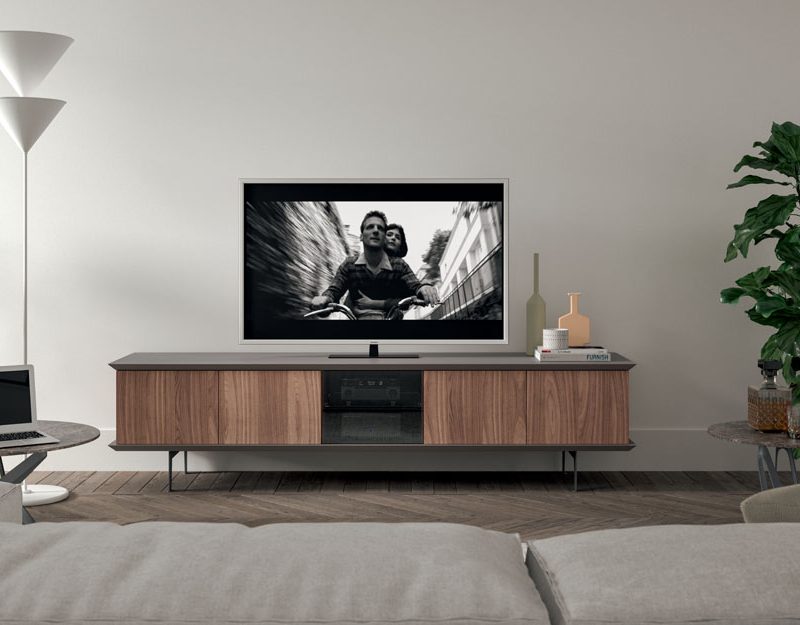 Madia con contenitore laccato, ante e fianchi in essenza o laccato. Ripiani interni in cristallo e anta in vetro fumè.