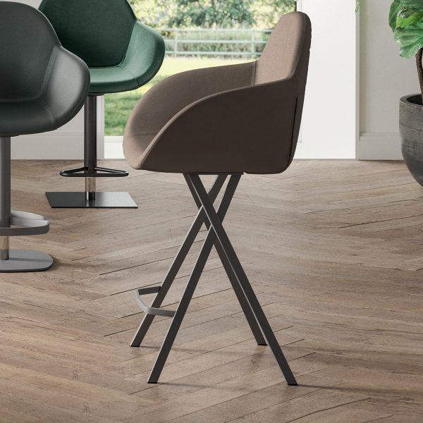 Sgabello fisso con base in metallo e seduta rivestita in pelle, eco pelle nabuk o velvet.