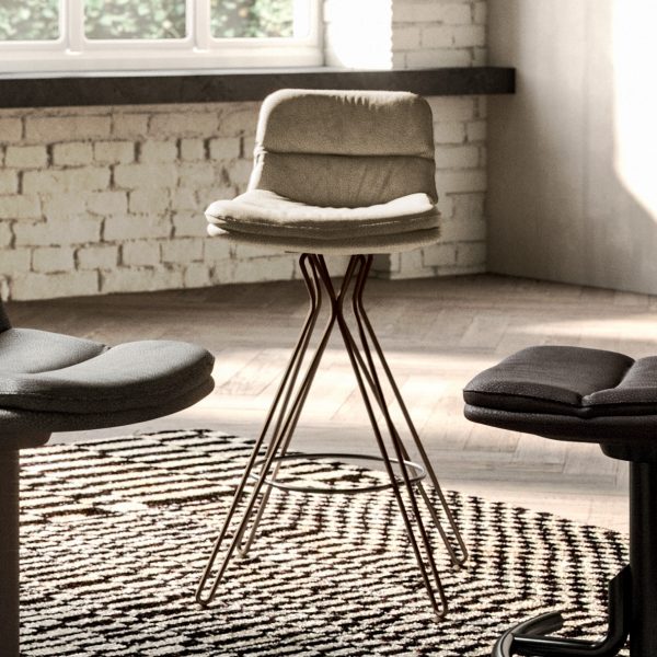 Sgabello con basamento fisso in metallo e seduta imbottita, rivestita in pelle o velvet, dall’effetto cosy con cuciture che fanno trasparire il loro morbido rivestimento. Sgabello comodo ed avvolgente realizzato per un living caldo e moderno.