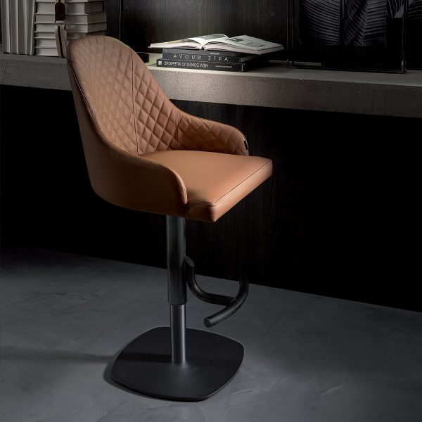 Sgabello con alzata a gas, basamento in metallo e seduta rivestita in pelle, velvet o eco pelle nabuk con interno trapuntato.