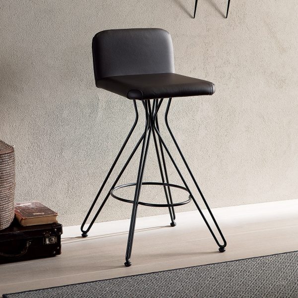 Sgabello fisso con basamento in filo metallico e seduta rivestita in pelle.