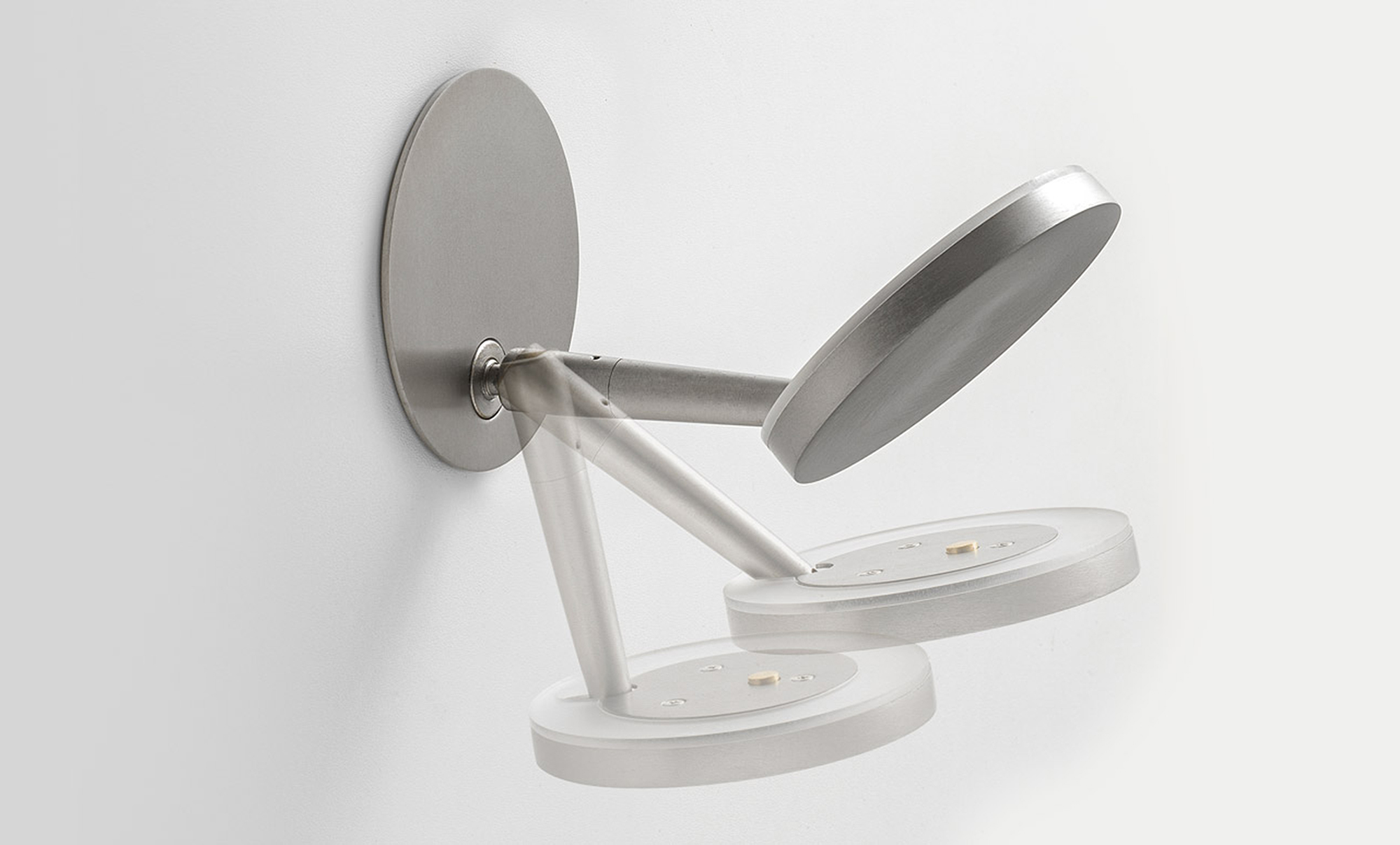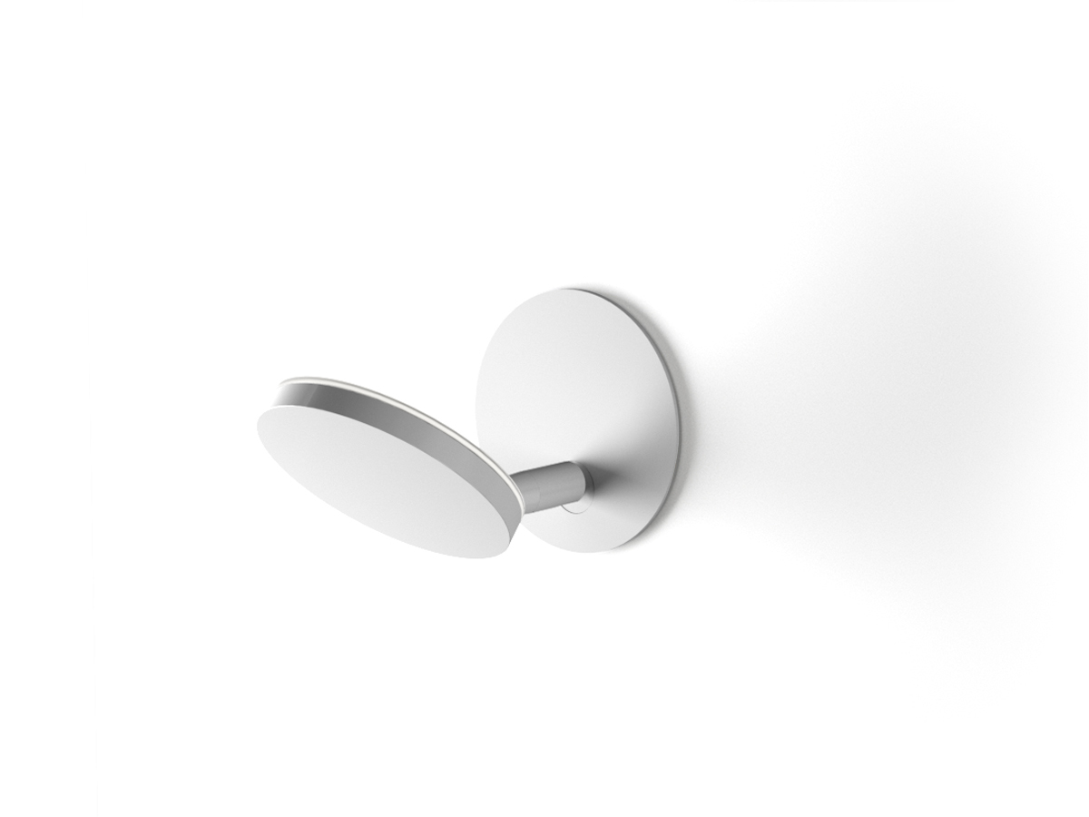 Lampada da sospensione, tavolo e parete (disponibile anche a incasso) con testa in pressofusione di alluminio. Diffusore in materiale acrilico con perimetro luminoso. Braccio conico decentrato, testa orientabile e comando Step DIM a 5 regolazioni di intensità luminosa caratterizzano le versioni da tavolo e parete, quest’ultima con snodo anche alla base, per una maggiore flessibilità nel posizionamento. La versione a sospensione, testa fissa e con tige centrale è disponibile in versione a emissione diretta e indiretta. Disponibile paralume in tessuto color avorio “Bella vestita” disegnato da Matteo Thun, da ordinare separatamente. Bianco, nero, titanio, bronzo e ottone satinato le finiture disponibili.