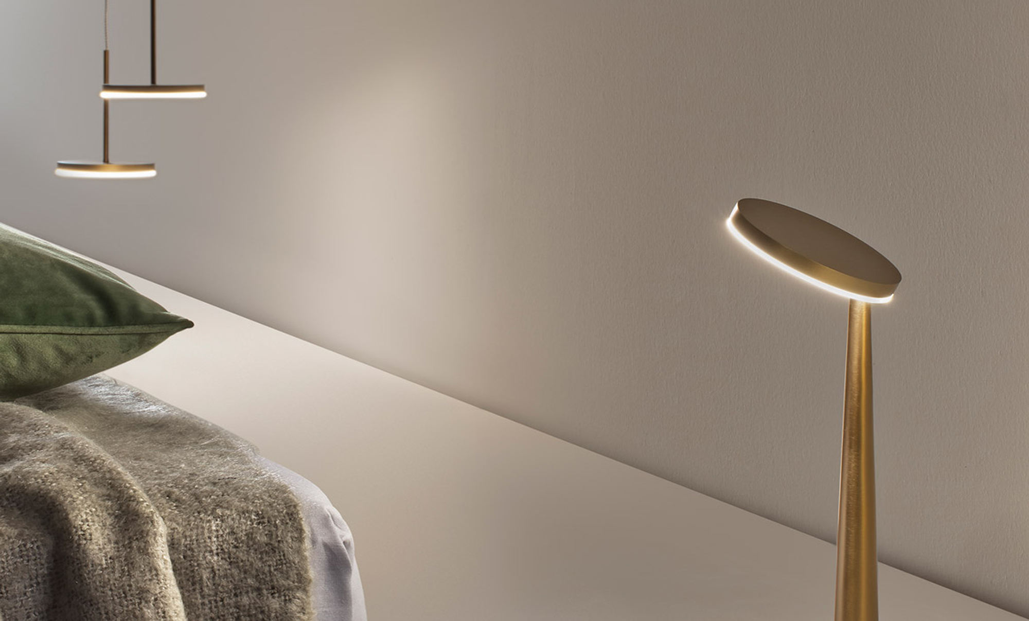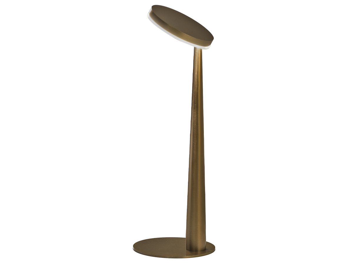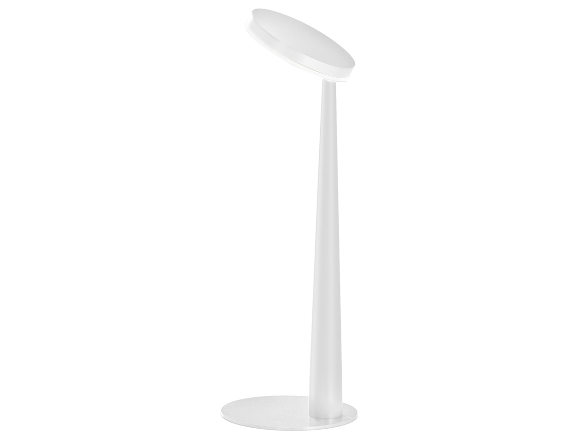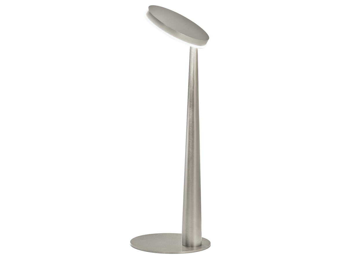 Lampada da sospensione, tavolo e parete (disponibile anche a incasso) con testa in pressofusione di alluminio. Diffusore in materiale acrilico con perimetro luminoso. Braccio conico decentrato, testa orientabile e comando Step DIM a 5 regolazioni di intensità luminosa caratterizzano le versioni da tavolo e parete, quest’ultima con snodo anche alla base, per una maggiore flessibilità nel posizionamento. La versione a sospensione, testa fissa e con tige centrale è disponibile in versione a emissione diretta e indiretta. Disponibile paralume in tessuto color avorio “Bella vestita” disegnato da Matteo Thun, da ordinare separatamente. Bianco, nero, titanio, bronzo e ottone satinato le finiture disponibili.