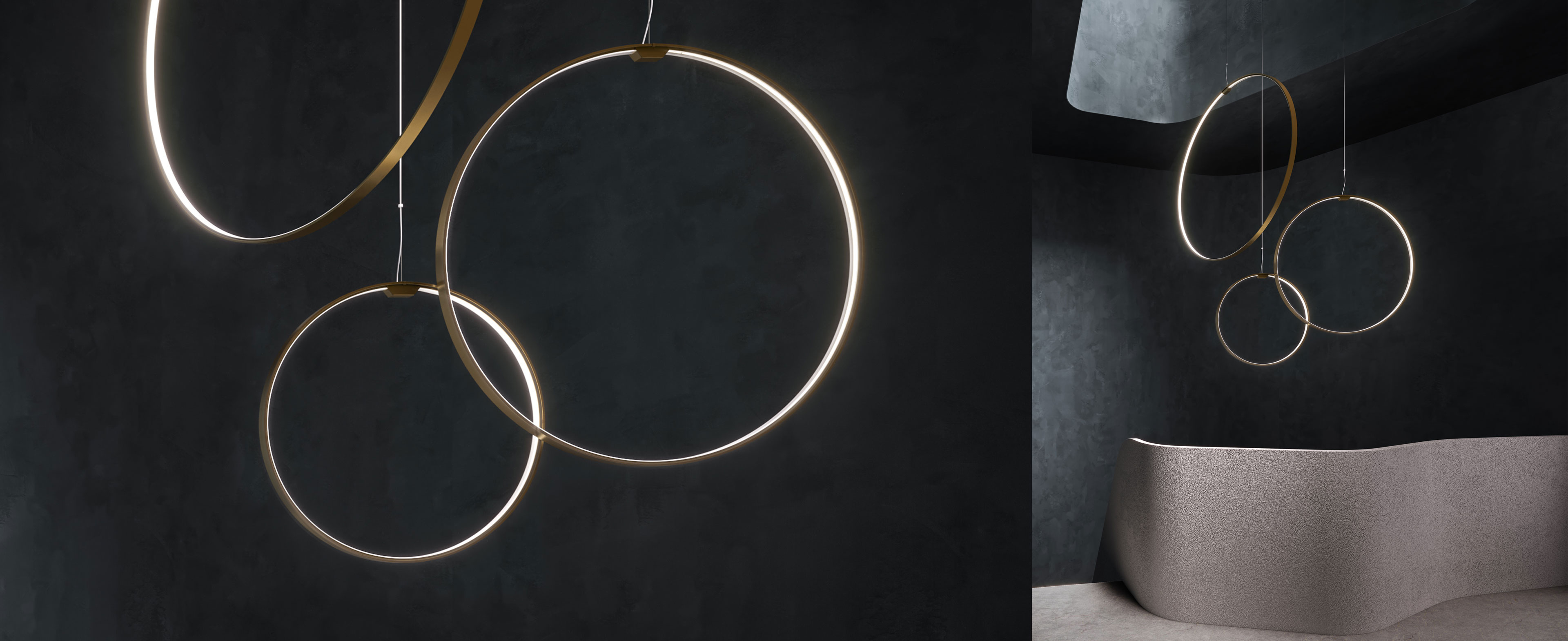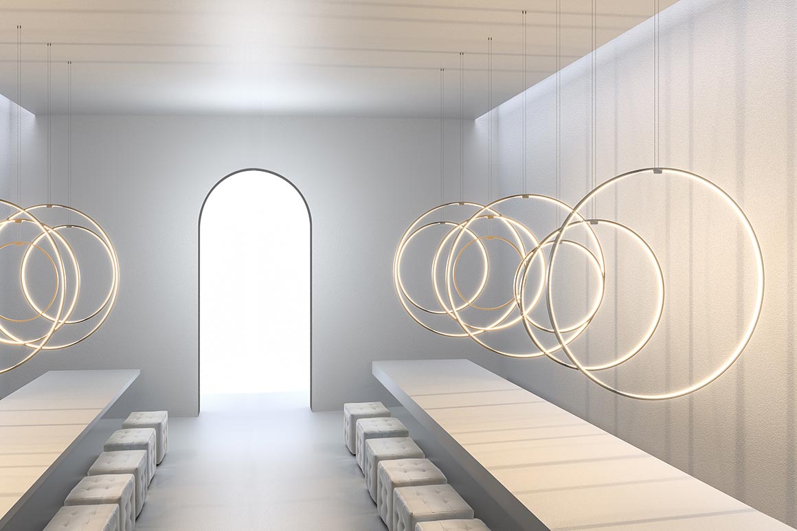 Lampada a sospensione verticale in alluminio estruso curvato con schermo in policarbonato opale. Emissione interna attraverso modulo LED e tecnologia DALI/Push DIM di serie su tutte le versioni inserita nel rosone. Anello rifinito con vernice poliacrilica color bianco, nero, titanio, bronzo e ottone satinato. Possibili colori custom su richiesta. Disponibilità di rosone per installazioni singole e rosoni per composizioni multiple da ordinare separatamente. Ideale per uffici, hall, zone living, grandi spazi, anche in abbinamento con Zero Round Acoustic e Arena Acoustic.