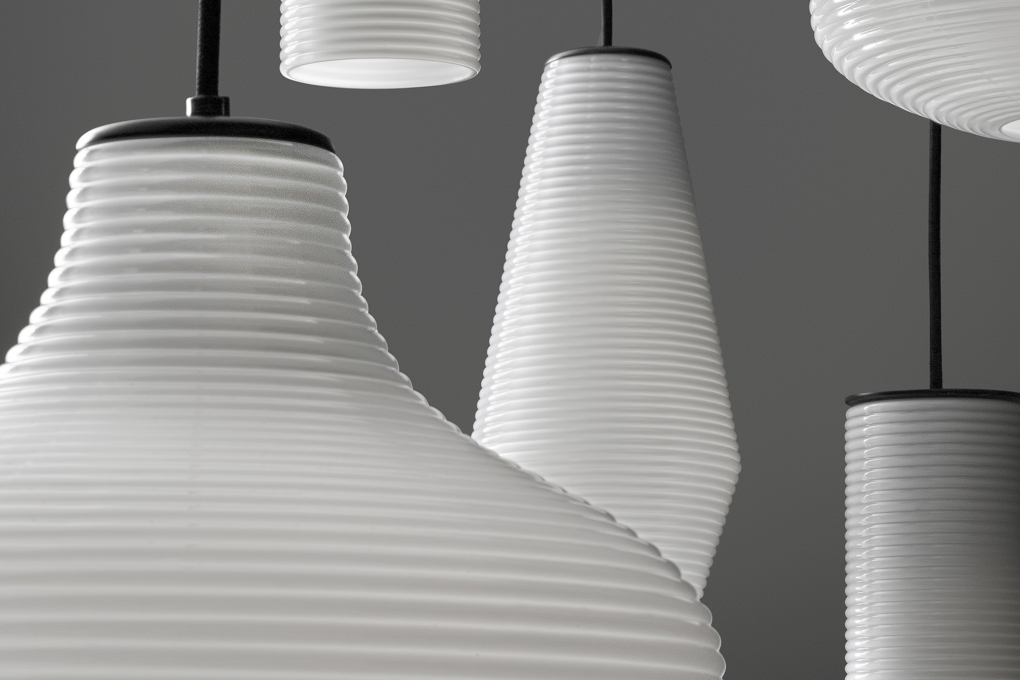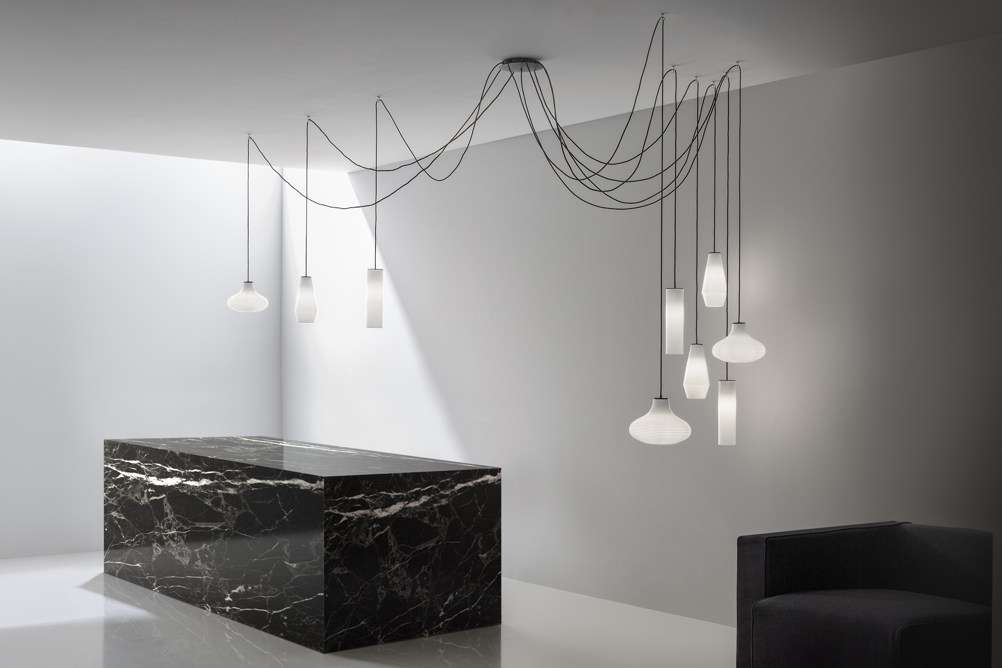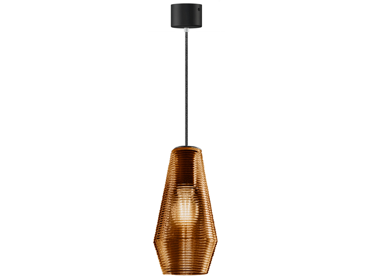 Lampada a sospensione in vetro soffiato con particolare finitura a coste dal gusto retrò. Rosone in metallo rifinito con vernice poliacrilica in color nero o nella nuova versione ottone satinato. Emissione di luce diffusa con attacco E27 e lampadina LED con filamenti a vista inclusa. Vetro soffiato disponibile in 7 colorazioni: cristallo, acciaio, ambra, bronzo, tabacco, verde e bianco lucido. Cavi elettrici in tessuto nero con possibilità di personalizzarne la lunghezza. Rosone a 8 uscite (+1 centrale). Ideale per strutture hospitality o zone living residenziali.