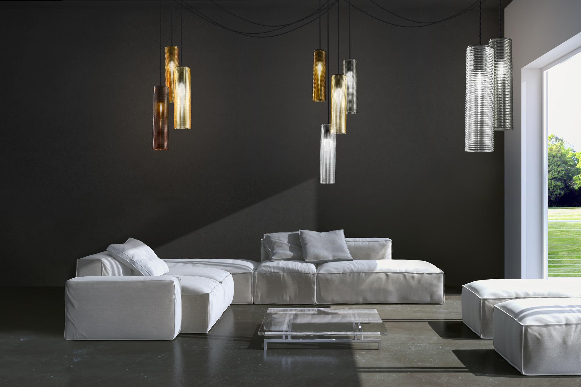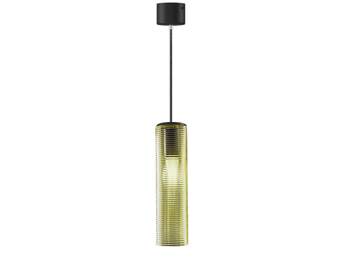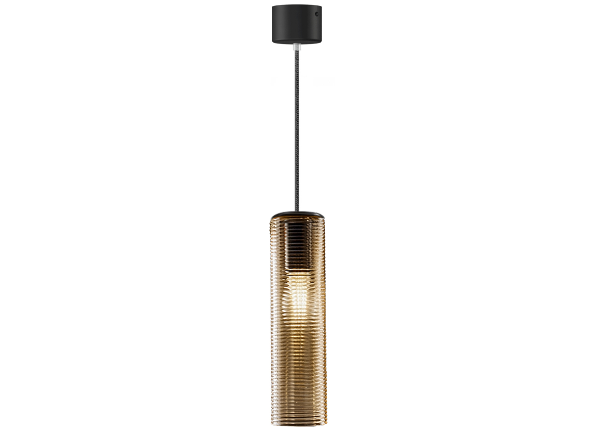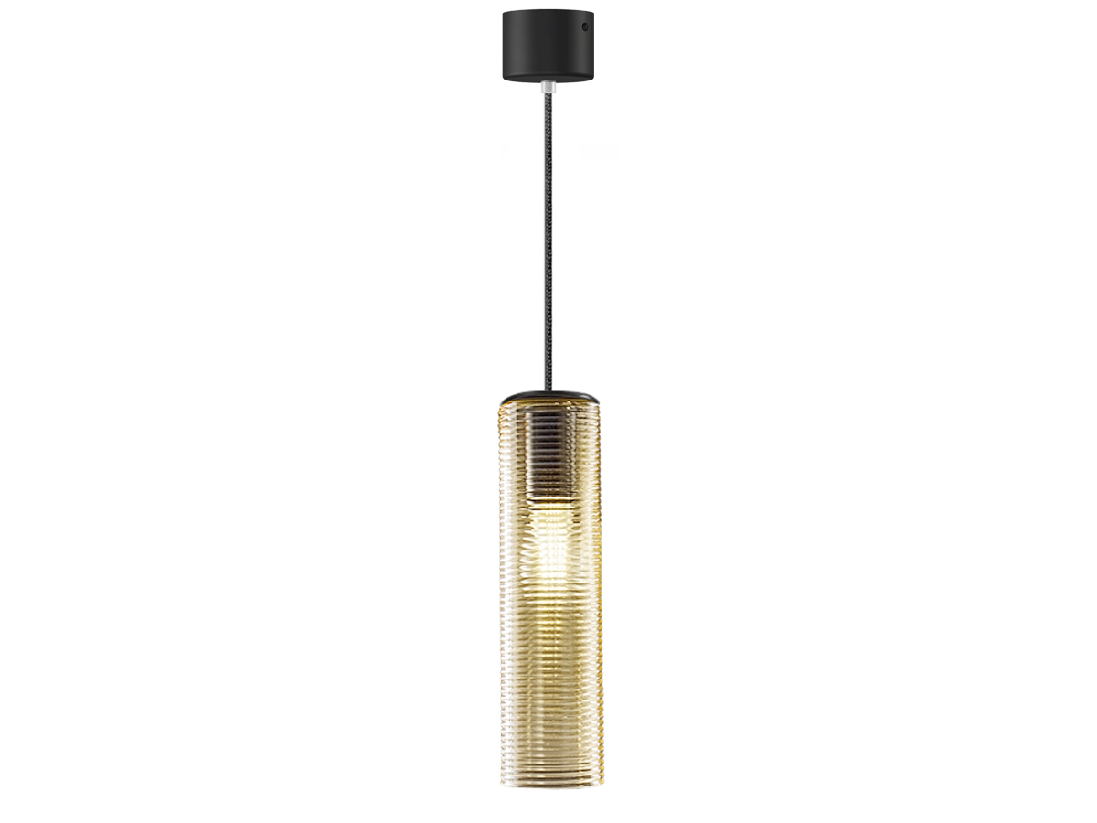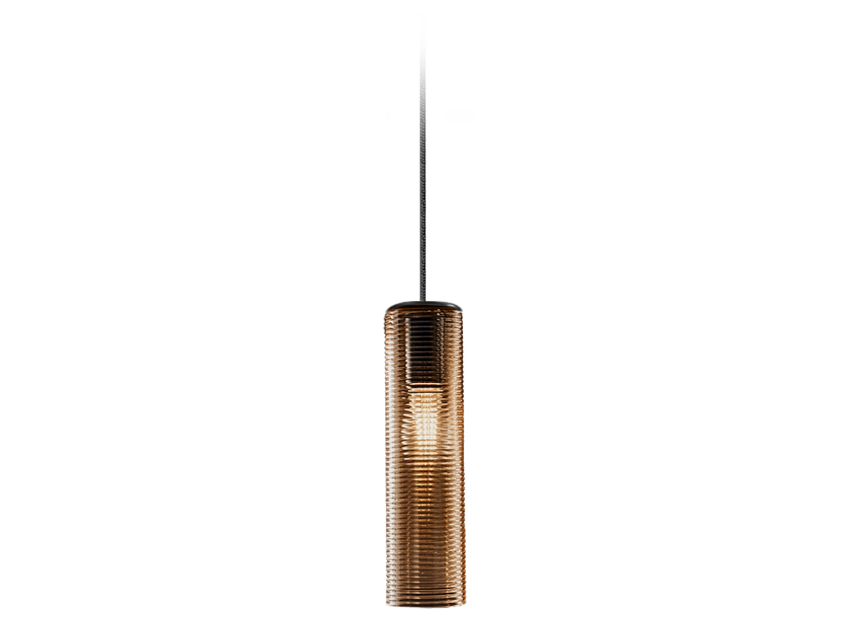 Lampada a sospensione in vetro soffiato con particolare finitura a coste dal gusto retrò. Rosone in metallo rifinito con vernice poliacrilica in color nero o nella nuova versione ottone satinato. Emissione di luce diffusa con attacco E27 e lampadina LED con filamenti a vista inclusa. Vetro soffiato disponibile in 7 colorazioni: cristallo, acciaio, ambra, bronzo, tabacco, verde e bianco lucido. Cavi elettrici in tessuto nero con possibilità di personalizzarne la lunghezza. Rosone a 8 uscite (+1 centrale). Ideale per strutture hospitality o zone living residenziali.