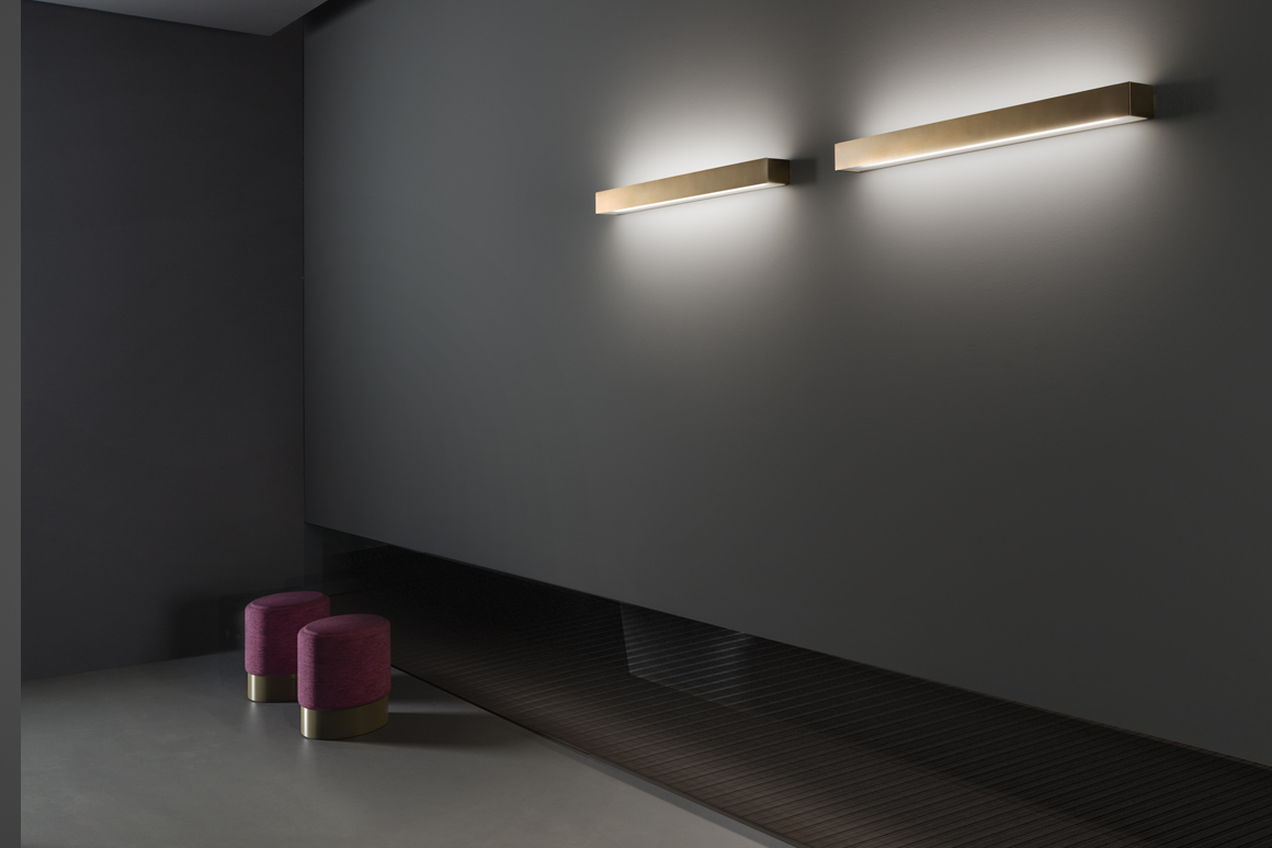 Lampade a parete con fascia in metallo o acciaio e diffusore in vetro. Emissione di luce diretta e indiretta ottenuta da una fonte luminosa LED. Fascia metallica rifinita con vernice poliacrilica in bianco, bronzo, ottone satinato o decorata a mano con foglia oro oppure fascia metallica in acciaio inox lucida o satinata. La fascia esterna non presenta viti a vista, perché fissata con meccanismo elastico. Lunghezze standard da 7 a 90cm. Ideale per ambienti residenziali e progetti moderni e minimalistici.