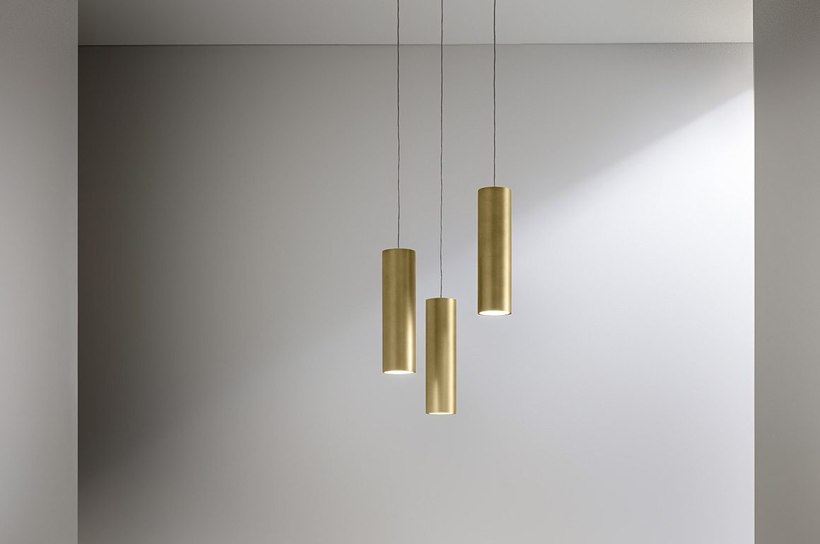 Lampade LED da sospensione e soffitto in tubo tondo di alluminio nei colori: bianco, nero, bronzo, ottone satinato e foglia oro.
