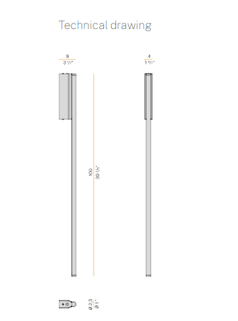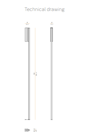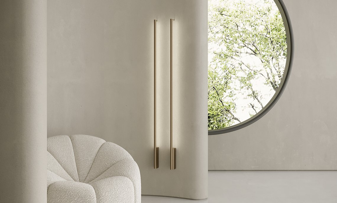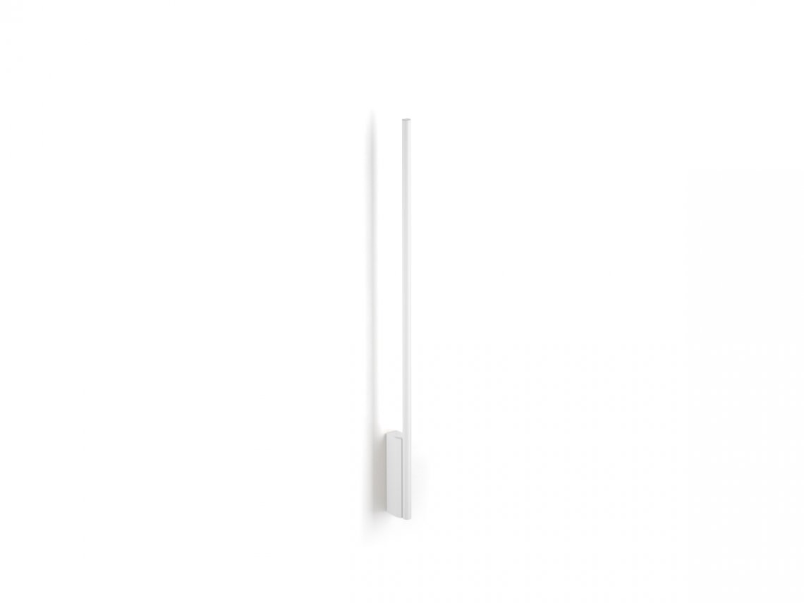 From the success of Hilow, this new series represents the founding principle of the system in its purest form: a linear module slender and discreet also in the light emission; a luminous stick to install on the wall or free-standing on the floor, with a structure in extruded aluminum and diffuser directed towards the wall for a comfortable indirect light effect. The intensity of light can be dimmed both in the wall mount version, thanks to the integrated driver through DALI or Push DIM technology, and in the floor version, equipped with electrical cable with dimming pedal. It is available in the finishes white, satin black, bronze, mat brass and titanium both for the wall-mount version and for the floor version, with base in black marquina marble. Floor version with base in travertine is paired with the metal finishes bronze and mat brass.