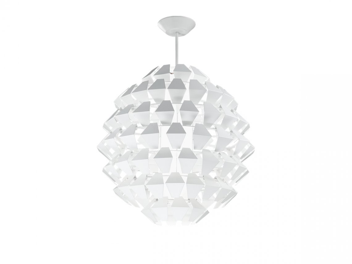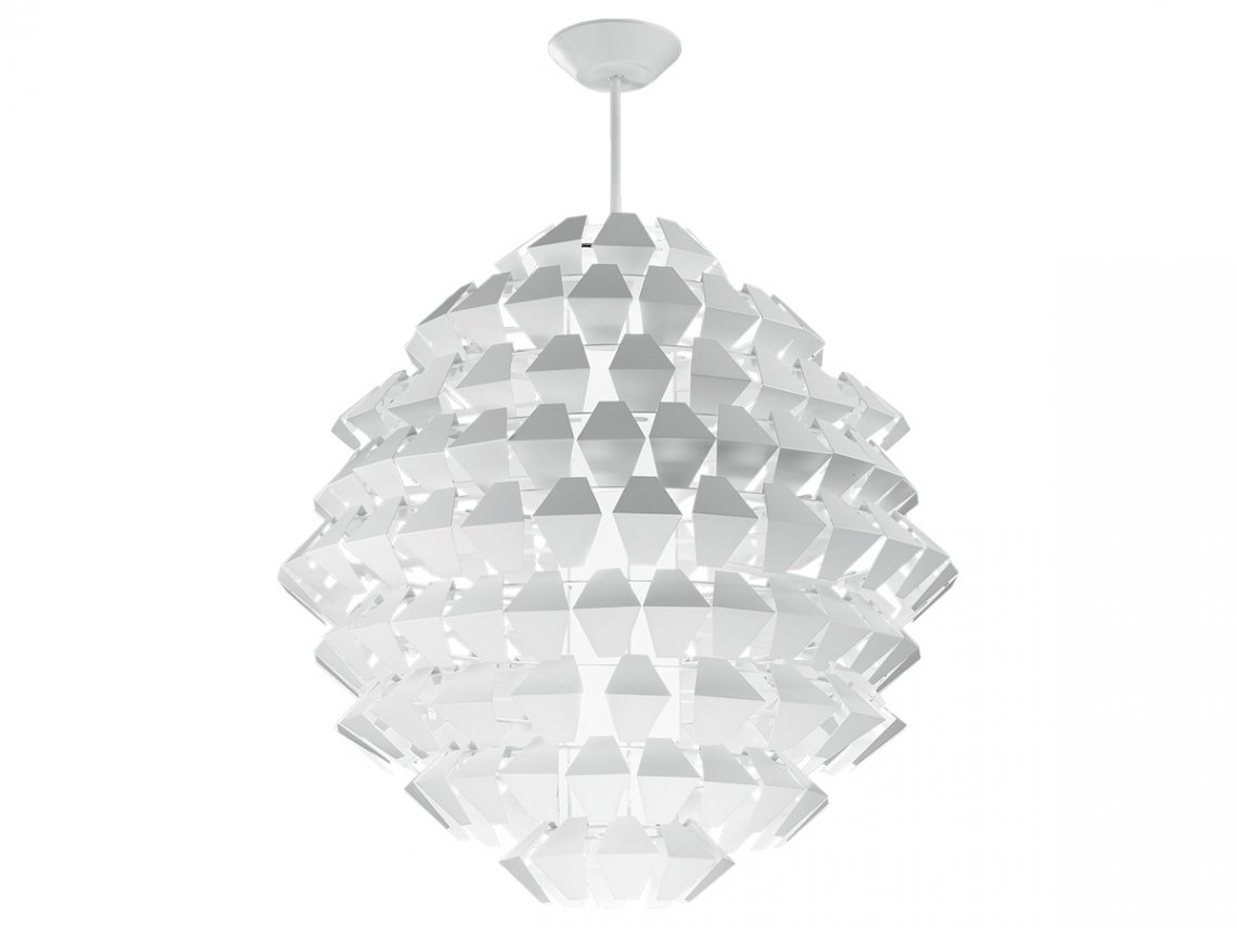 Suspensions, ceiling with pieces of white painted metal. On request gold, silver or copper leaf. Mat glass diffuser.