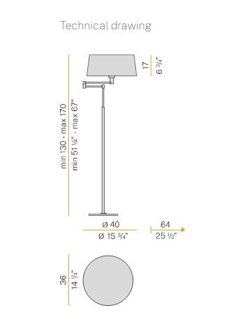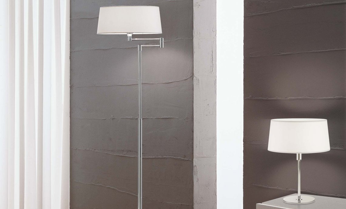 Extending floor, table and wall lamp in polished brass in chrome and white shade.