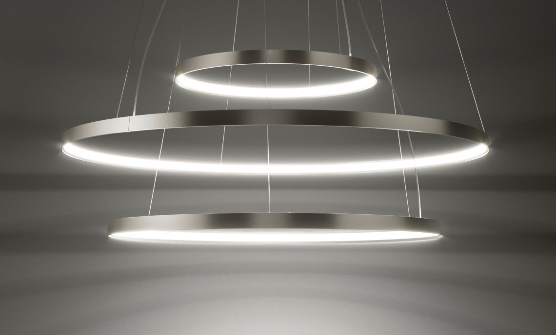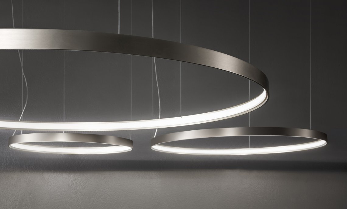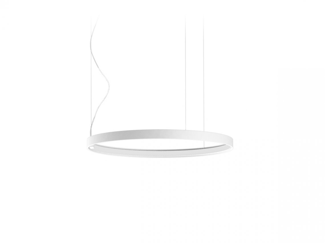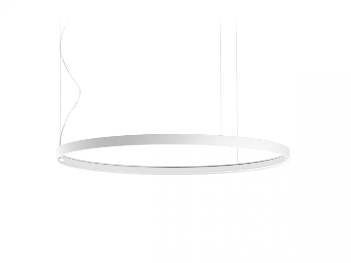 Horizontal suspension lamp in extruded curved aluminum, with opal polycarbonate screen. Emission on the internal side provided by LED modules with ZigBee technology integrated into the canopy. Polyacrilic paint white, black, titanium, bronze and mat brass finishes are available. Ideal for residential spaces and living areas.