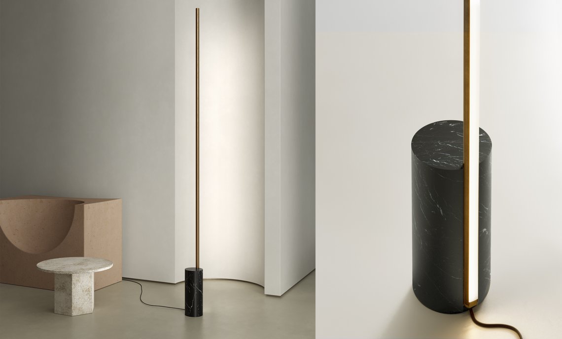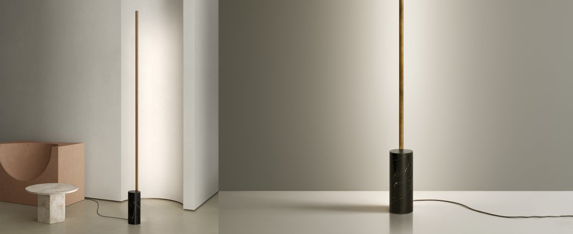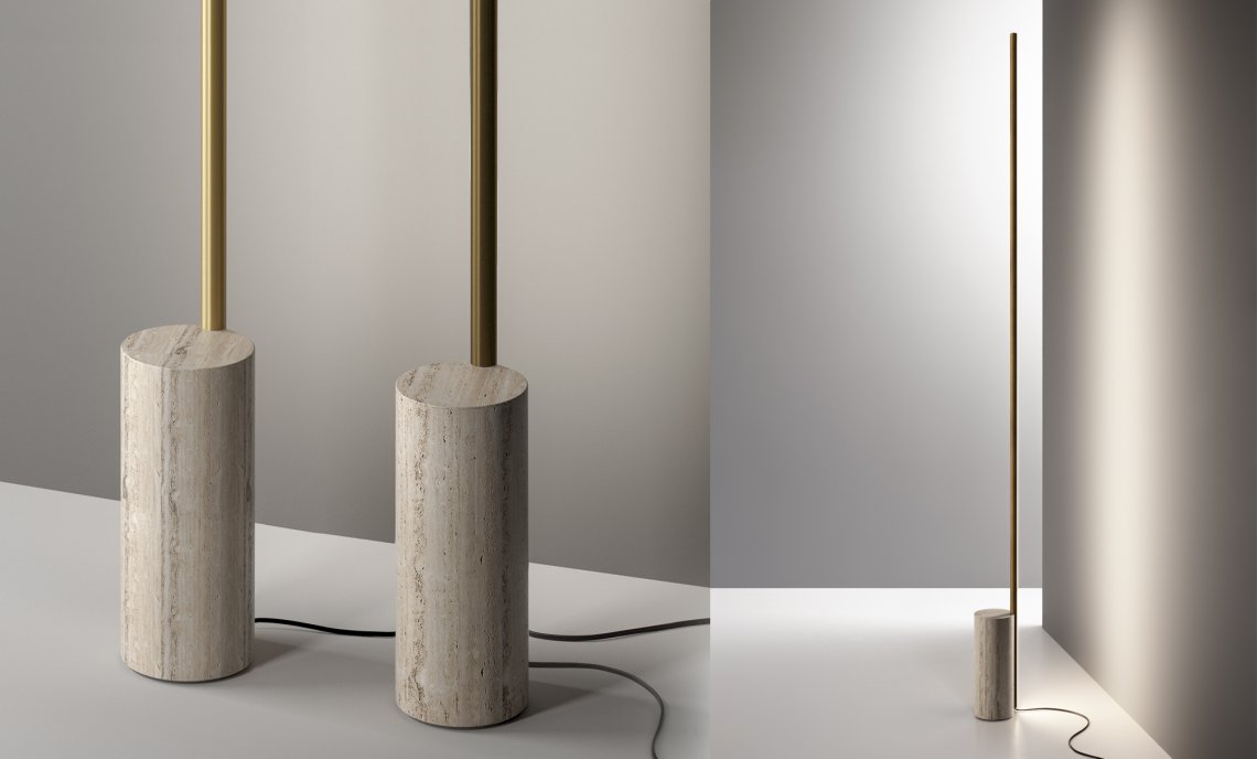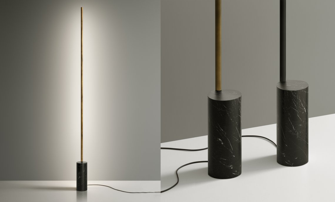 From the success of Hilow, this new series represents the founding principle of the system in its purest form: a linear module slender and discreet also in the light emission; a luminous stick to install on the wall or free-standing on the floor, with a structure in extruded aluminum and diffuser directed towards the wall for a comfortable indirect light effect. The intensity of light can be dimmed both in the wall mount version, thanks to the integrated driver through DALI or Push DIM technology, and in the floor version, equipped with electrical cable with dimming pedal. It is available in the finishes white, satin black, bronze, mat brass and titanium both for the wall-mount version and for the floor version, with base in black marquina marble. Floor version with base in travertine is paired with the metal finishes bronze and mat brass.