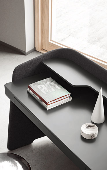 The perfect complement to the bedroom, Vanity was conceived as a dual-purpose piece, serving as both a dressing table and desk. Sophisticated and exclusive, it invites you to indulge in those personal activities that make you feel like you’re stealing some me-time, like writing, dreaming of a holiday or attending to your appearance in an intimate, personal spot. The shaped shelf can be supplemented with the mirror featuring a fine burnished brass frame, while the generous top underneath features a functional slot at the back for wiring, a drawer with hidden runners and an organizer that comes in different sizes: details that help give the overall look a light, elegant air. With an extensive range of finishes to choose from, you can also customize the unit and create your ideal look: colourful and sporty or more restrained and stylish.