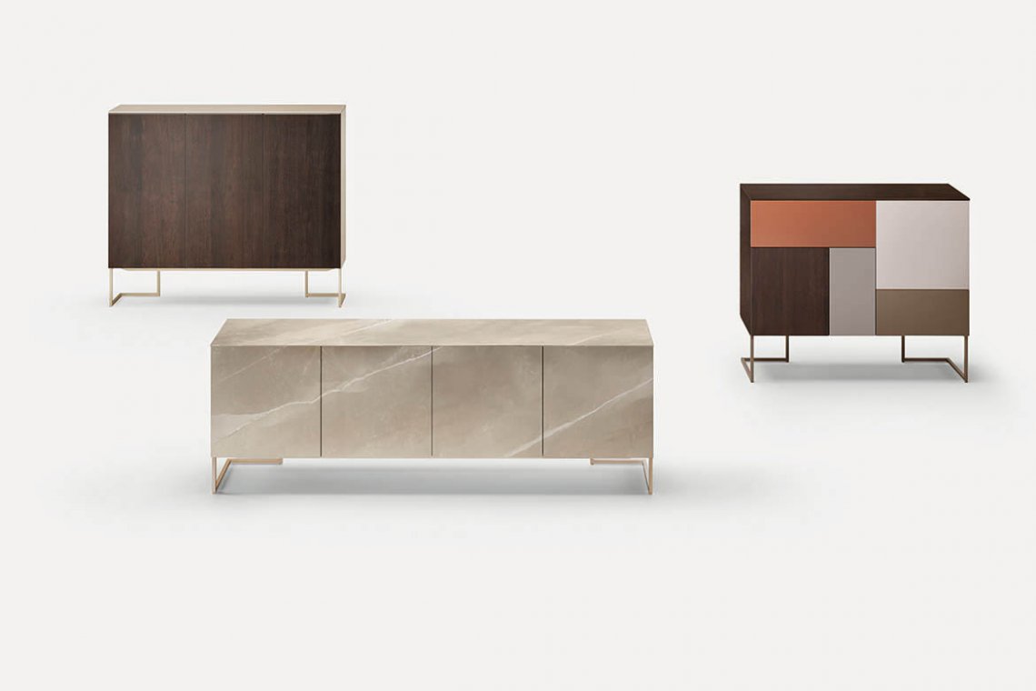 Refined and adaptable, the Grafica sideboard ideally complements the living room or bedroom is an ideal complement for both living room or bedroom. It is available in a number of compositions and a wide range of finishes to meet the most diverse needs. The collection includes compositions with drawers, modules with hinged or flap doors and two different openings: with handle or push-pull mechanism. The elegant base with its distinctive, L-shaped profile, is the characteristic that makes this product unique.