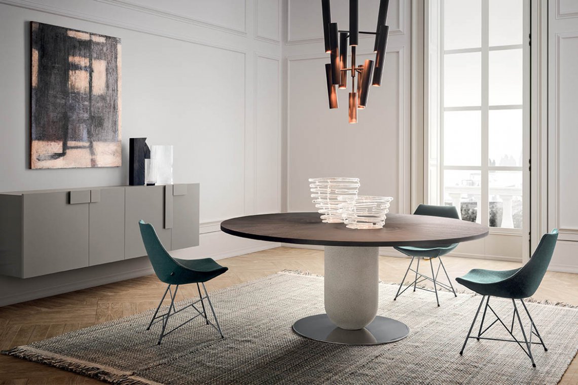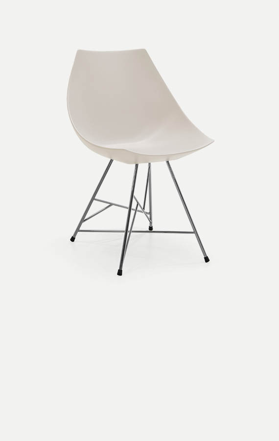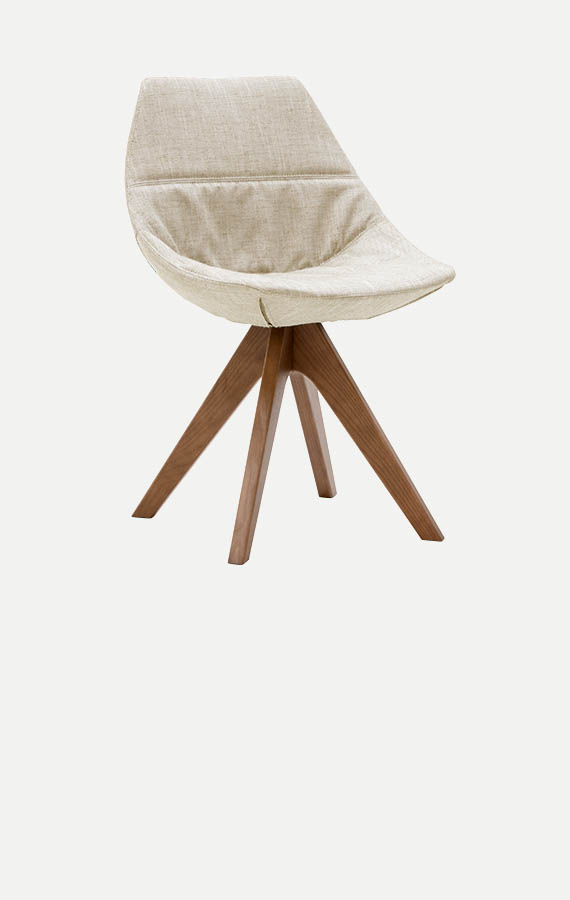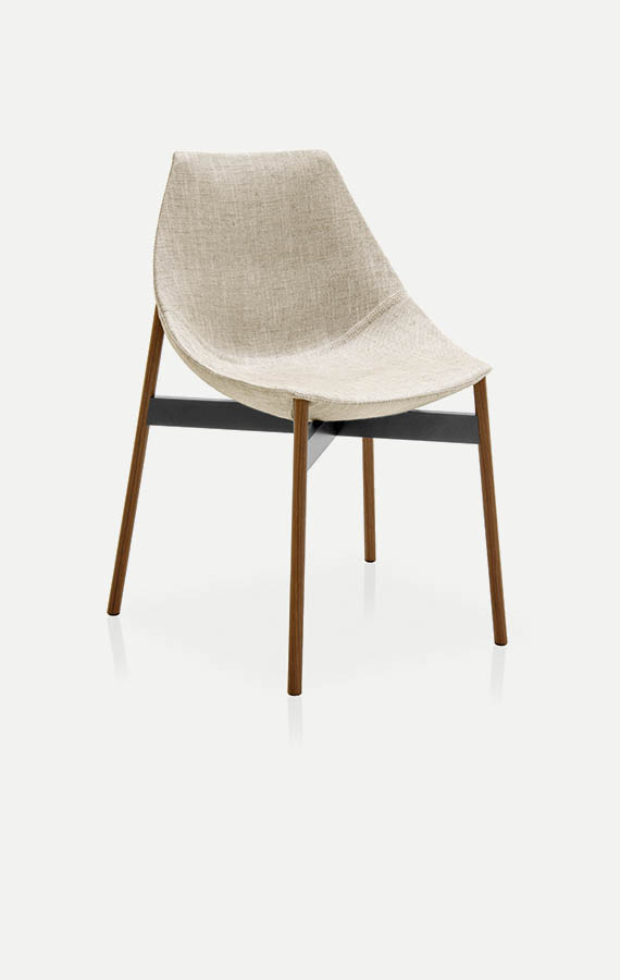 The broken lines and the vivid colours enrich the differences between the bases, which are light and steady. The signature feature is its seat: the shape, reminiscent of the cross-section of an egg, is designed to be comfortable and cocooning, in both the rigid lacquered version and the padded version with non-removable or loose covers, available in fabric, leather and synthetic leather. The base is the variable and comes in three versions: metal pylon, solid wooden slanted legs and tubular base.