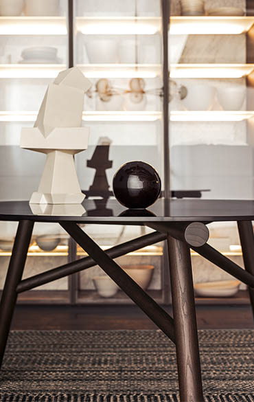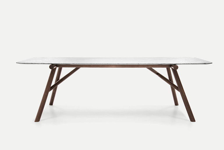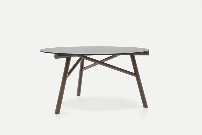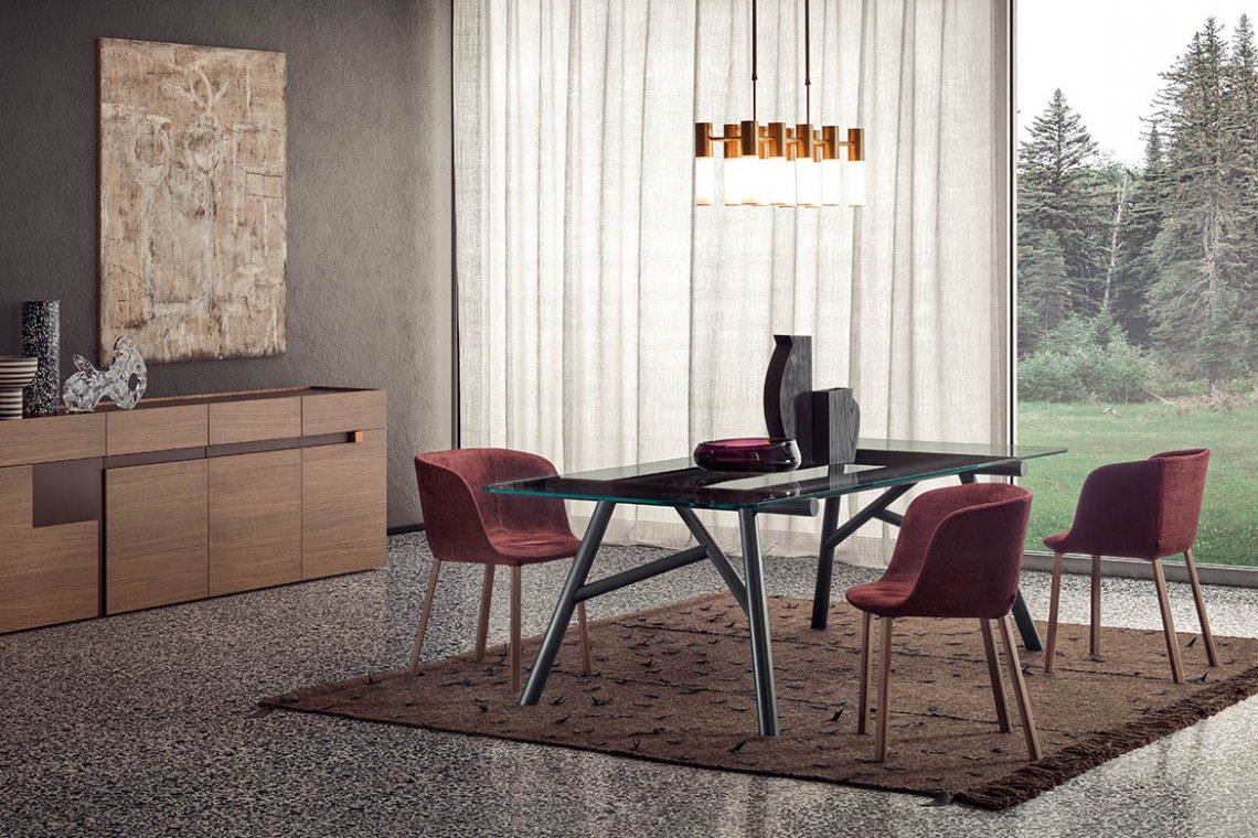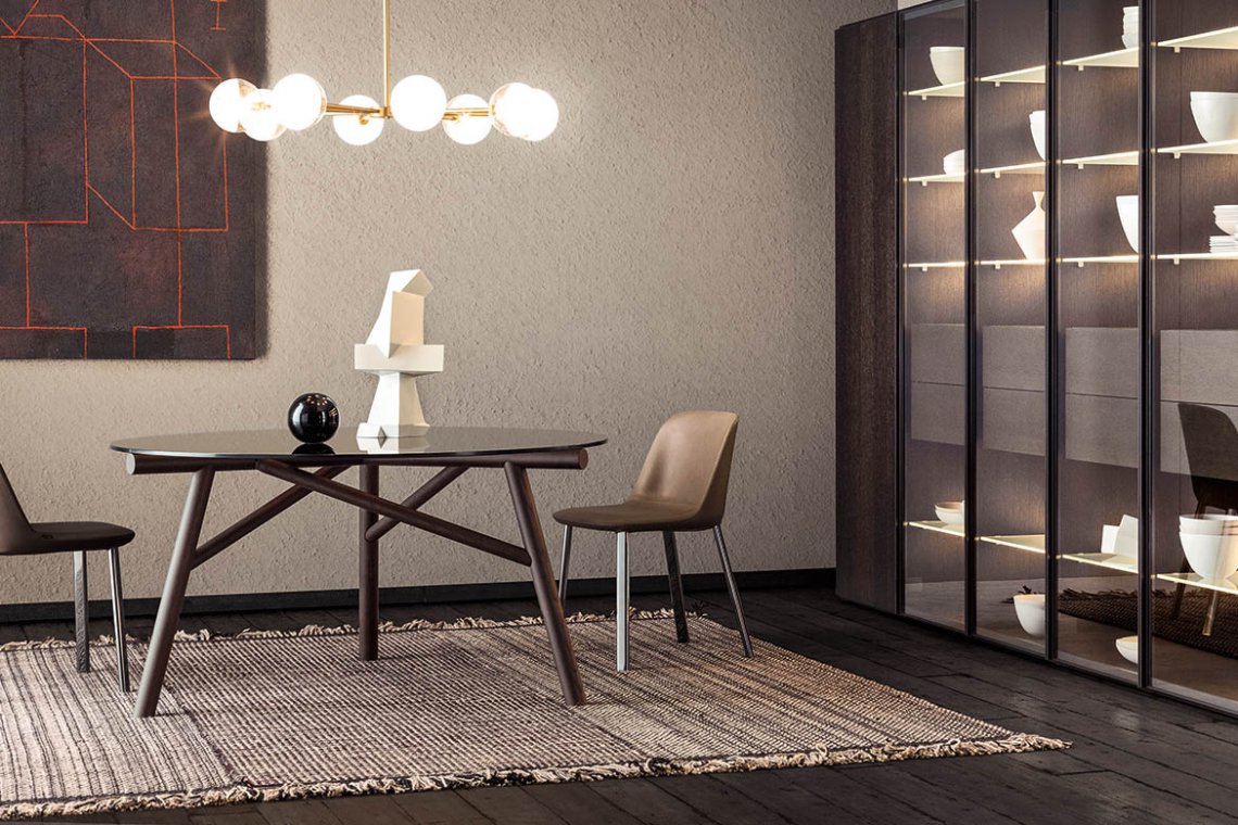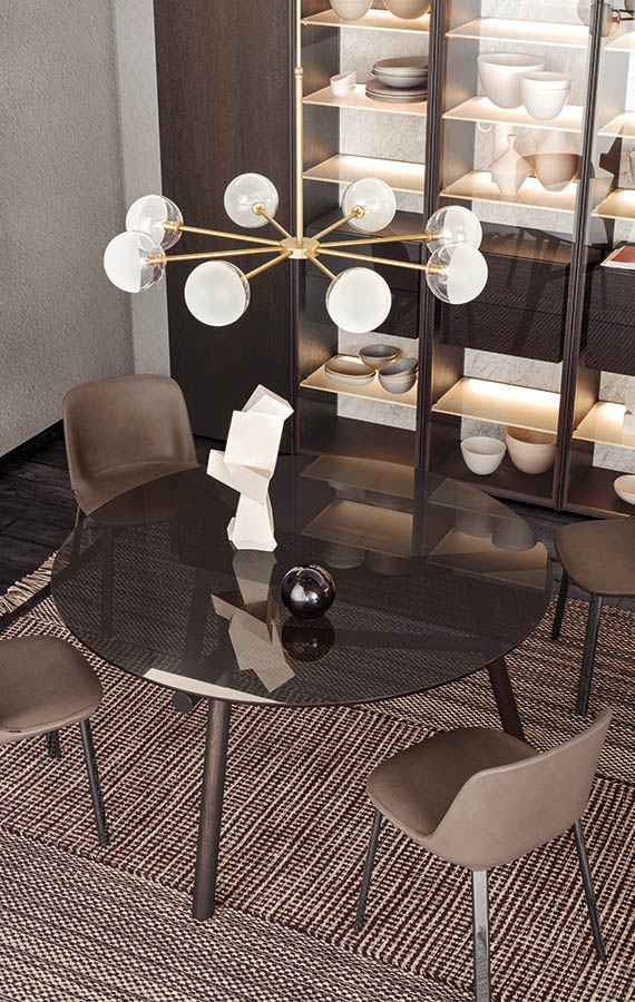 There is further collaboration with Emilio Nanni, who previously designed Haik and Asolo for Pianca. His architectural training and experience, combined with his versatile expression of his creativity as designer and artist, lead him to create iconic, highly eloquent designs, like the Maestro table. Perfectly balanced between the geometric concept and structural stability, Maestro affirms itself as the synthesis of those forces and achieves its style from this comparison and encounter. The segment becomes the main design feature, while, overall, it traces out a design that recalls the cross beams of architectural trusses. The structure is available in solid wood and painted metal, while the table top options are smoked glass, wood and natural cement.