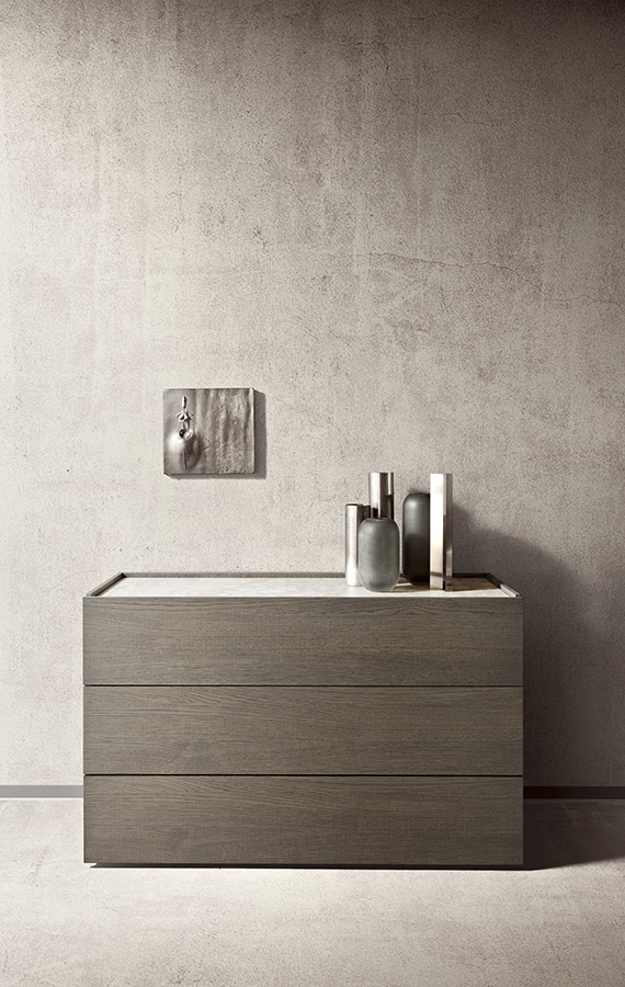 Simple, clean lines combined with precious and sophisticated material details give Atlante its distinctive as well as versatile connotative presence: a line of units with regular and oversized drawers designed to sit happily in the middle of a room and feel at home in any interior. The drawer fronts match the colour of the carcass and have handy finger grips set into the sides for opening. The top and the side trims details make the design truly unique: made from marble, mirros and glasses of collection they create a refined marriage of the classic and the modern, a quality that is clearly expressed in the essentiality of the volumes.
