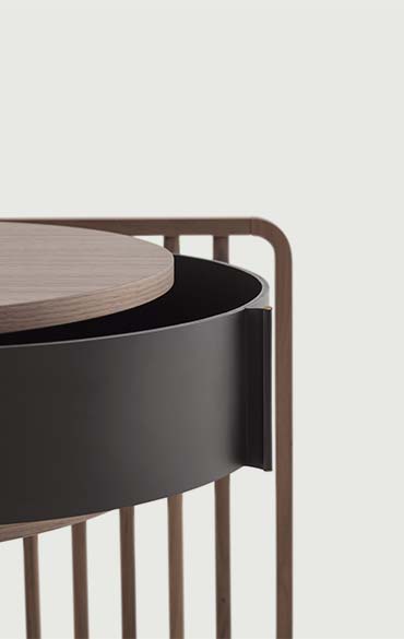 The rustling of the wind echoes in the silence of nature: a visual reference to canes, creating light, evocative and reassuring pieces of furniture. The new Palù collection portrays a concept of small-scale architecture, formed from the relationship between presence and absence. The distinctive features of these complements, a bedside table and bench seat, are the linear effect of solids and empty spaces, and profound harmonies. The curves created using a sequence of wooden rods define the space, indicating the sense of the limit in a neat and feminine series. The frame embraces suspended volumes, made out of air: an upholstered seat, a Vienna straw shelf, elegant drawers. In the bedside table, the round drawer rotates towards the bed, transforming into a second shelf.