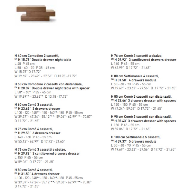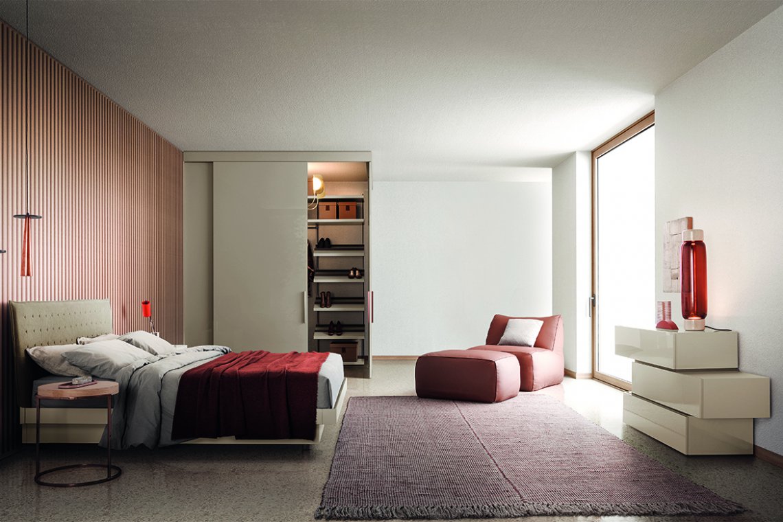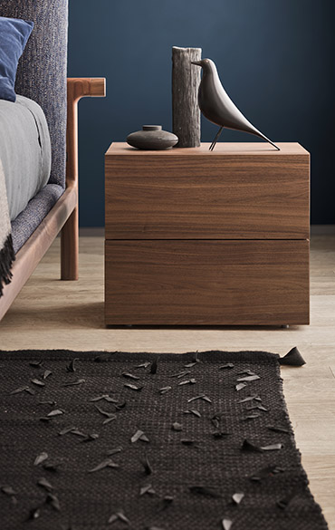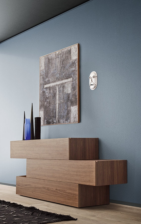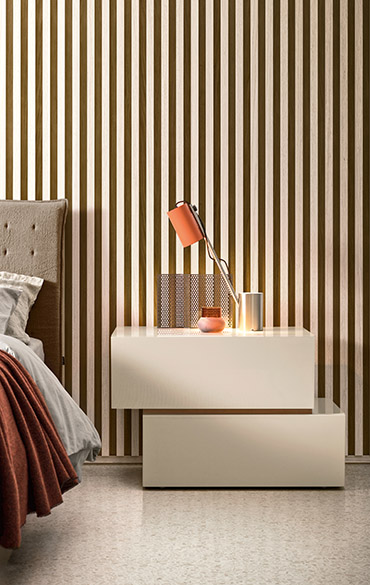 With its elegant, linear design People is a range of chests-of-drawers and bedside units offering multiple options in terms of arrangements, dimensions and styles. Straight or off-set, floor-standing or wall-hung, they furnish the bedroom with their modern, refined appeal. A glamorous touch is afforded by adding lacquered, metallic or wooden inserts to arrangements. The fronts are handle-less and provided with side channels to open the drawers.