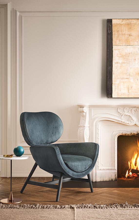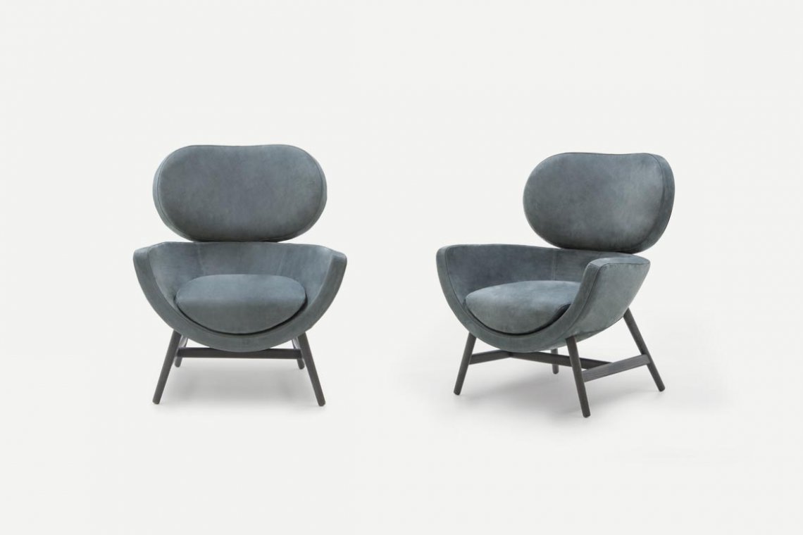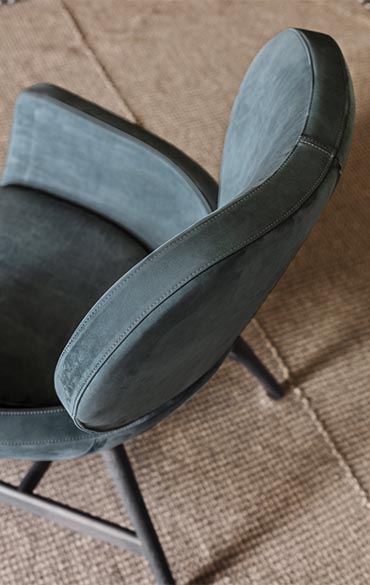 A compact, elegant and comfortable design: Laurie is a tribute to the best Italian tradition reinterpreted in a contemporary key by the Calvi Brambilla studio. The fresh appeal of its image is achieved using elementary, cocooning, geometric shapes connected by a generous amount of formal minimalism. Its distinctive shape consists of a lower shell and a large, curved, backrest attached using a simple mechanism borrowed from the automobile industry. Its cosy, almost motherly volumes invite you to sit down and relax. The base offers an informal and agile support to the frame with its four, slanting legs that are more reminiscent of a chair than of an armchair, making Laurie extremely versatile and adapting it to any room, from the reception room to the bedroom. Extensive customisation options contribute to its versatility. To satisfy any taste, numerous combinations can be achieved using the many finishes available for the base and cover.